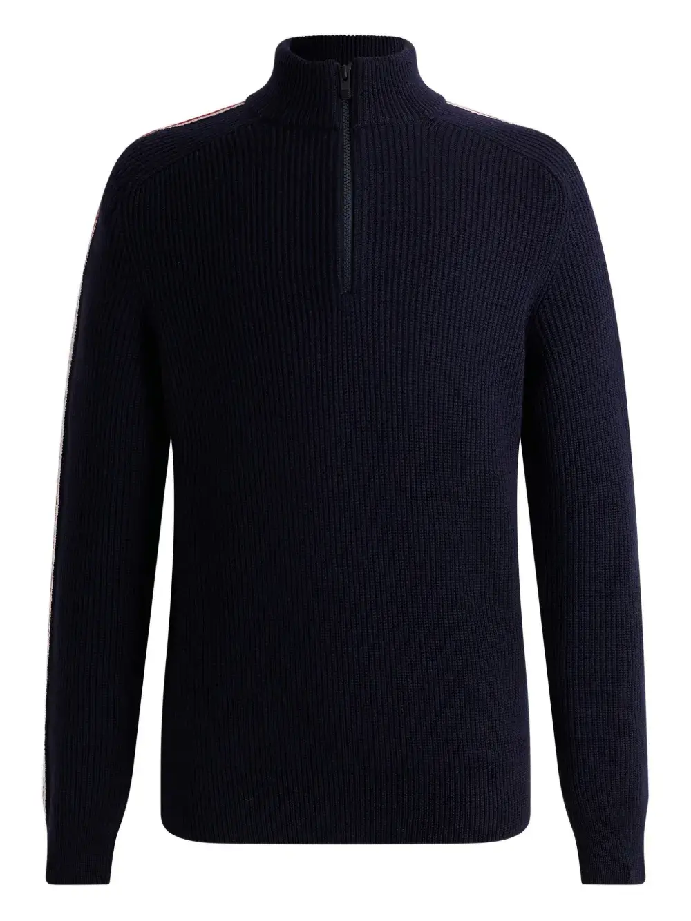 темно-синий вязаный джемпер в рубчик с высоким воротником, застежкой-молнией, полосками на рукавах и нашивкой-логотипом на рукаве