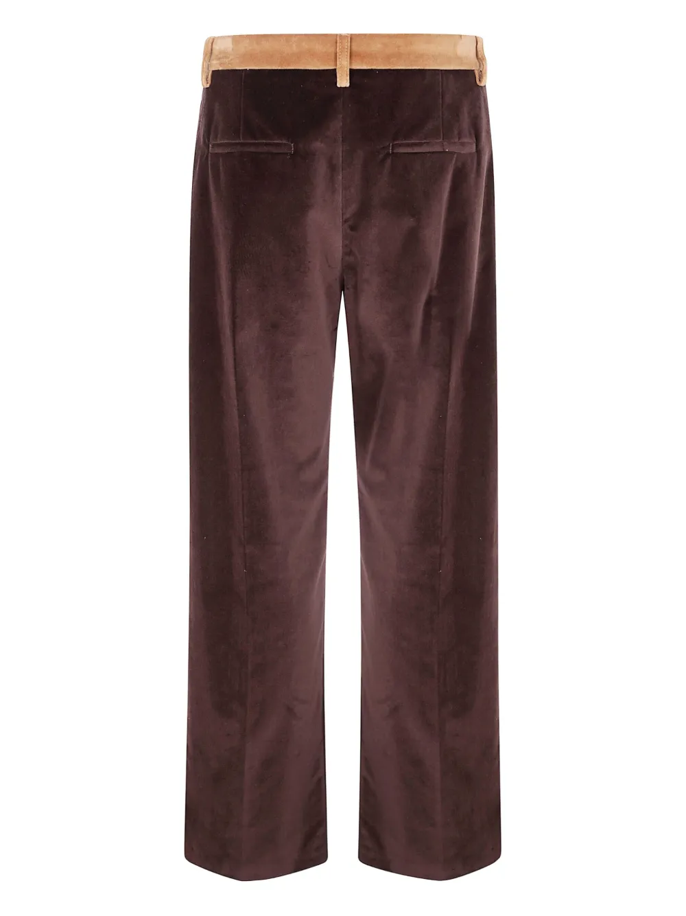 темно-коричневые брюки с контрастным поясом, прорезными карманами сзади, косыми карманами спереди и скрытой застежкой