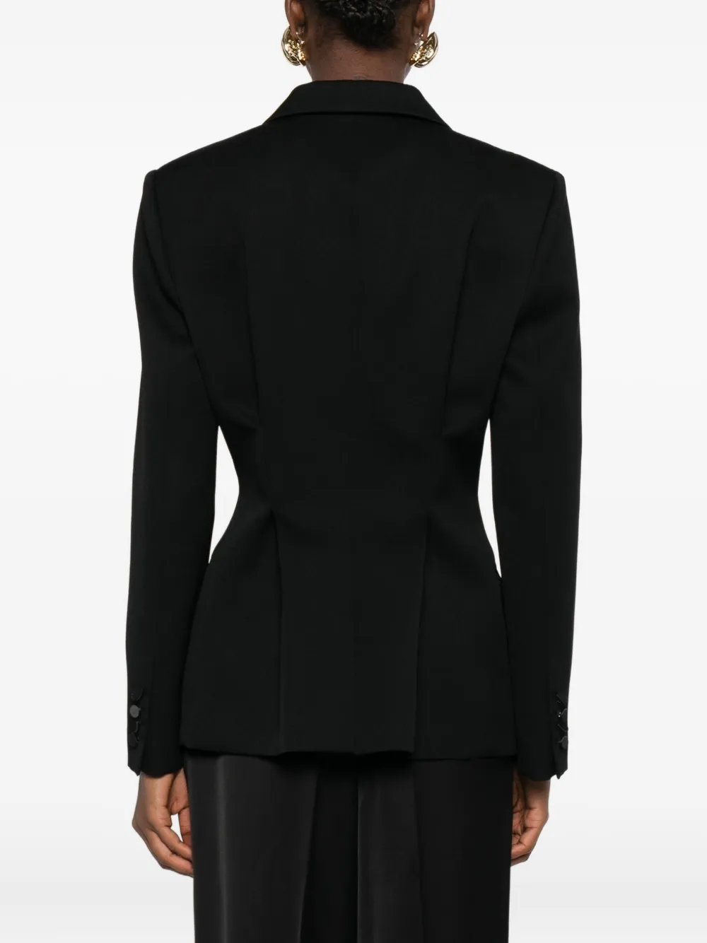 черный пиджак с лацканами с вырезом, застежкой на одну пуговицу, передними клапанными карманами, длинными рукавами, из шерсти