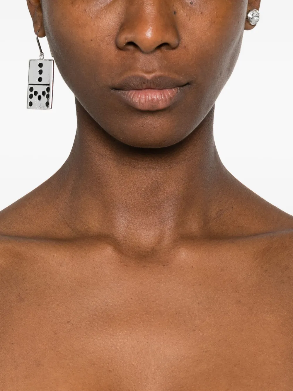 Серебристый оттенок, дизайн домино, украшены декоративными элементами, застёжка-гвоздик, эти серьги специально не совпадают друг с другом