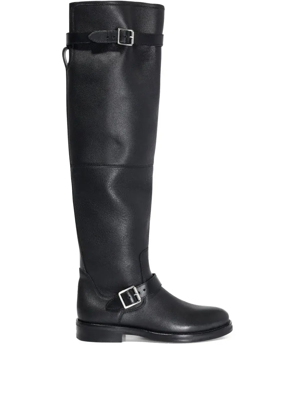 чёрные ботфорты, застёжка-пряжка вверху, застёжка-пряжка на лодыжке, плоская подошва, петля сзади