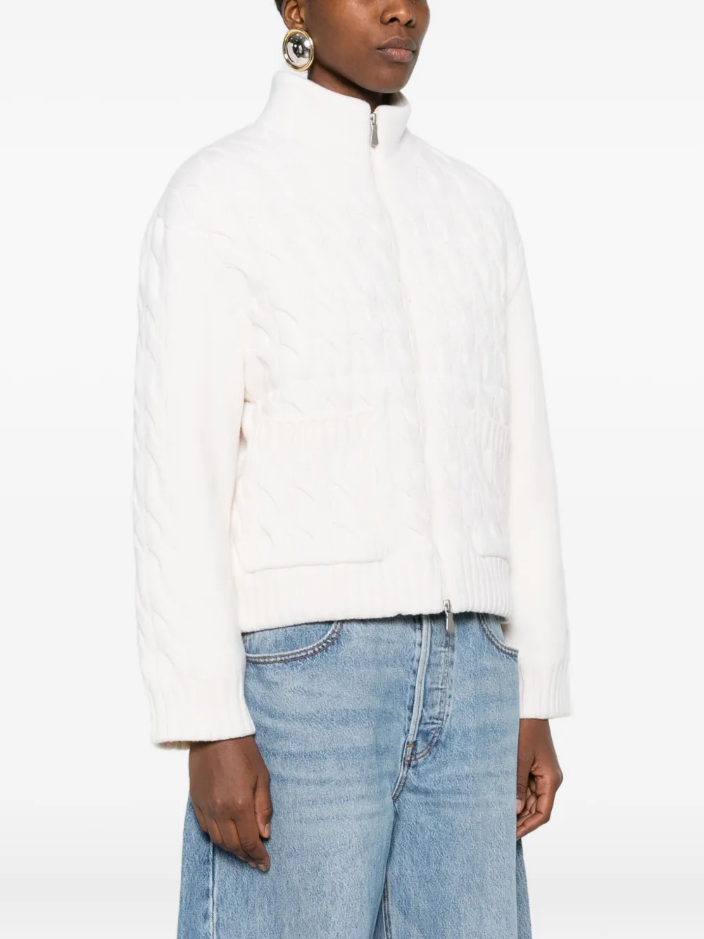 белый кабельный трикотаж, застёжка-молния, два кармана, ребристый низ и манжеты