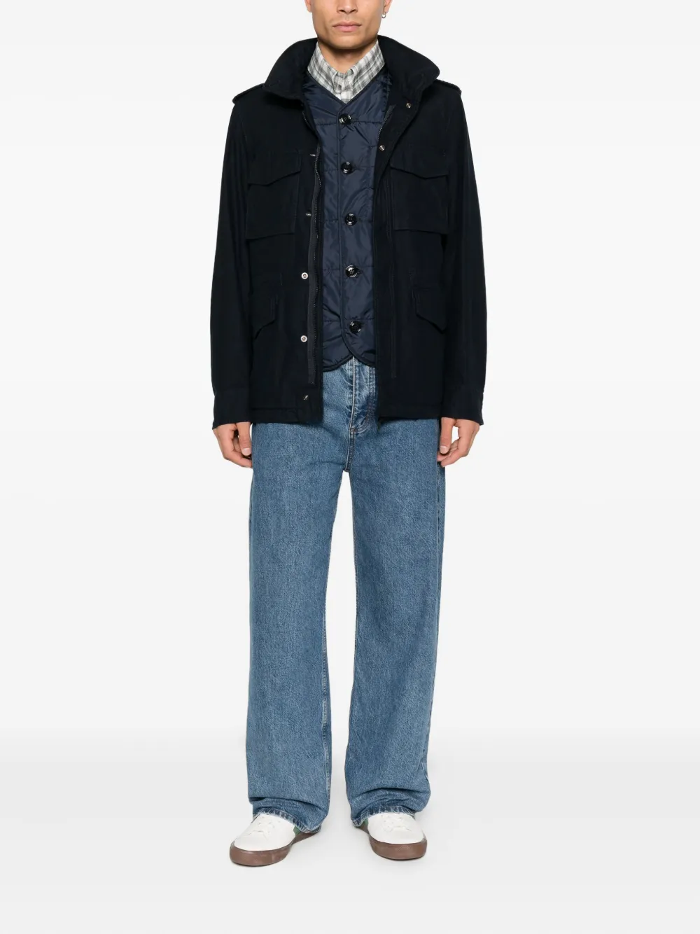 темно-синий, скрытая застежка спереди, длинные рукава, эполетами, четыре накладных кармана спереди