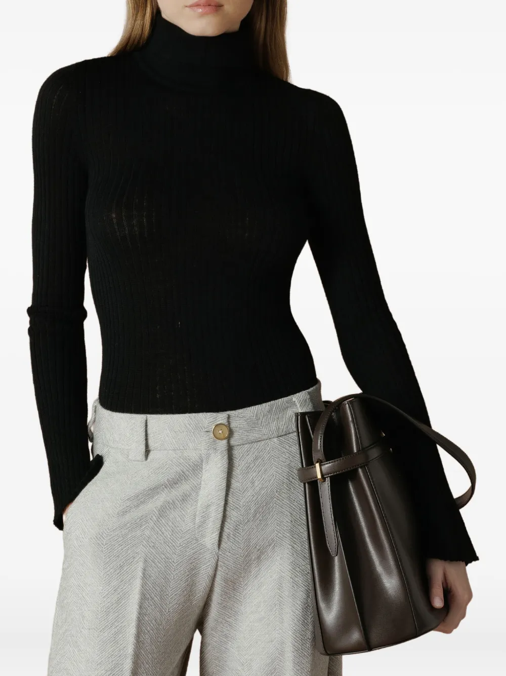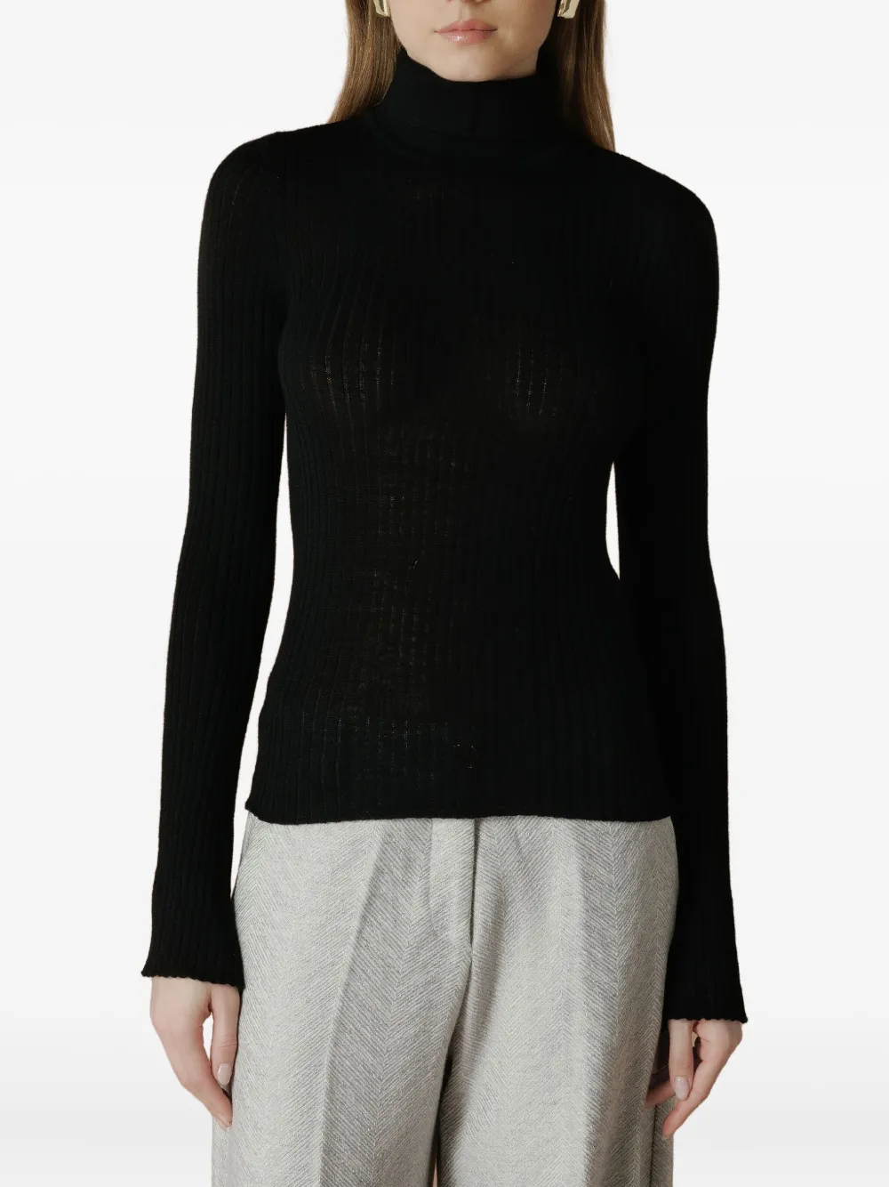 черная вязаная водолазка в рубчик с длинными рукавами из тонкого трикотажа