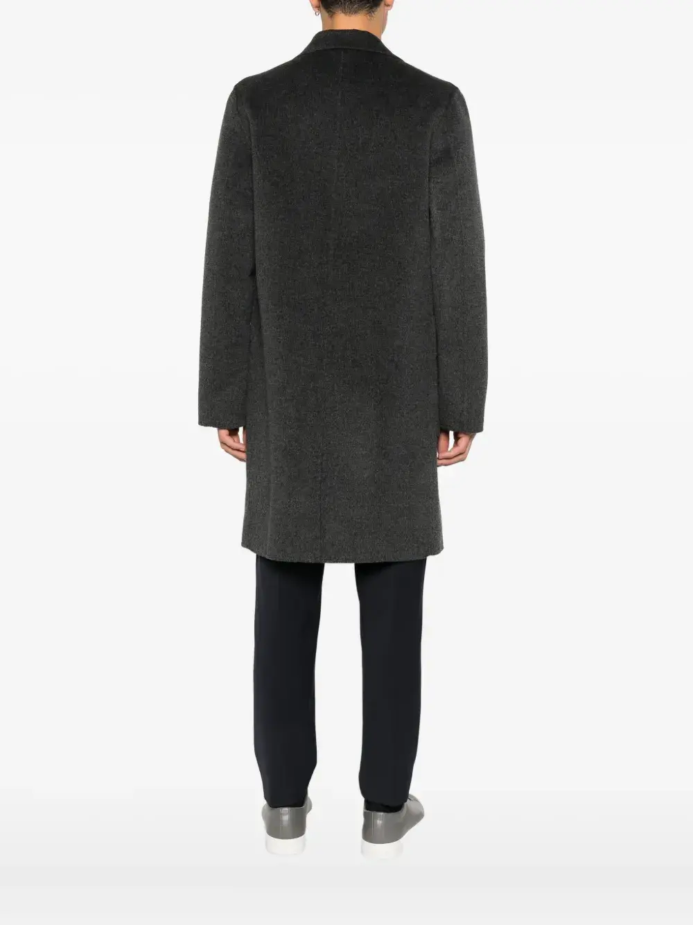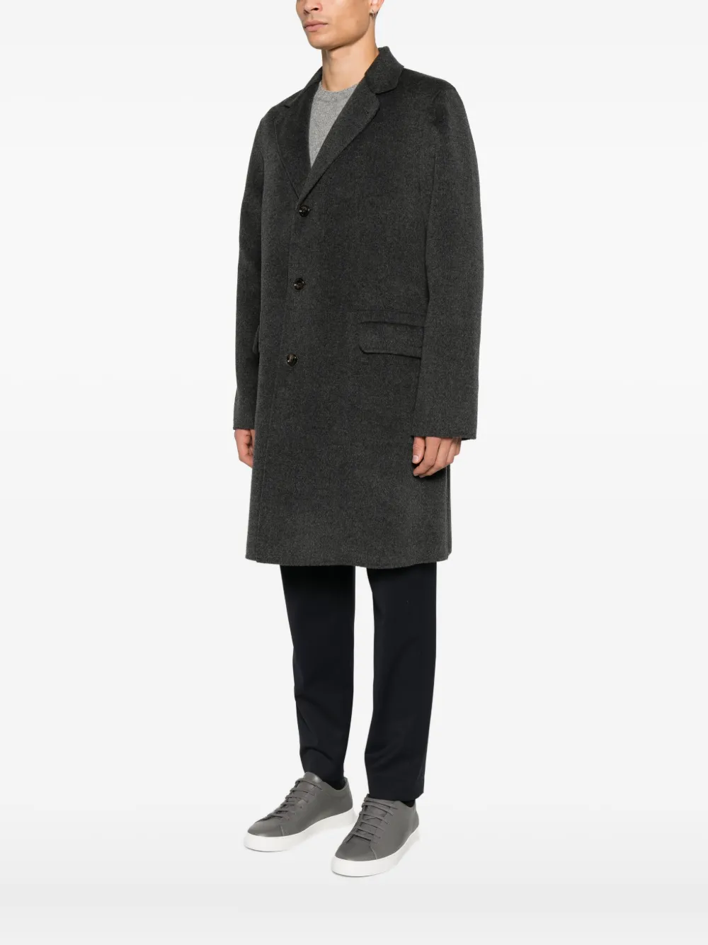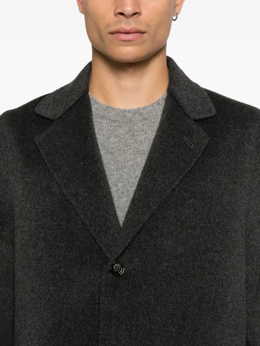 антрацитовые заострённые лацканы, застёжка на пуговицы спереди, длинные рукава, два передних кармана с клапанами
