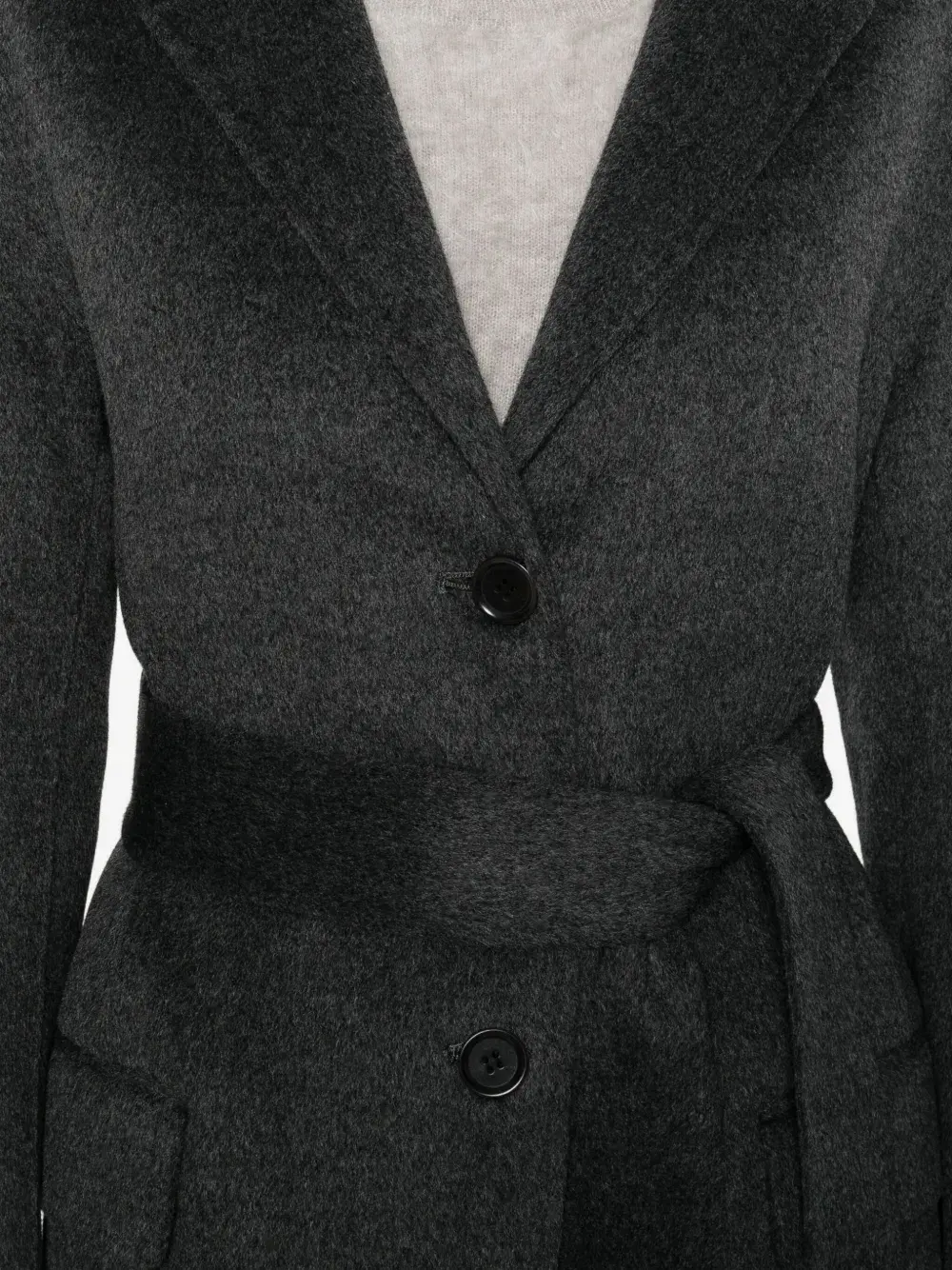 серый с поясом, застёжка на пуговицы, лацканы с вырезом, прорезные карманы с клапанами, длинные рукава