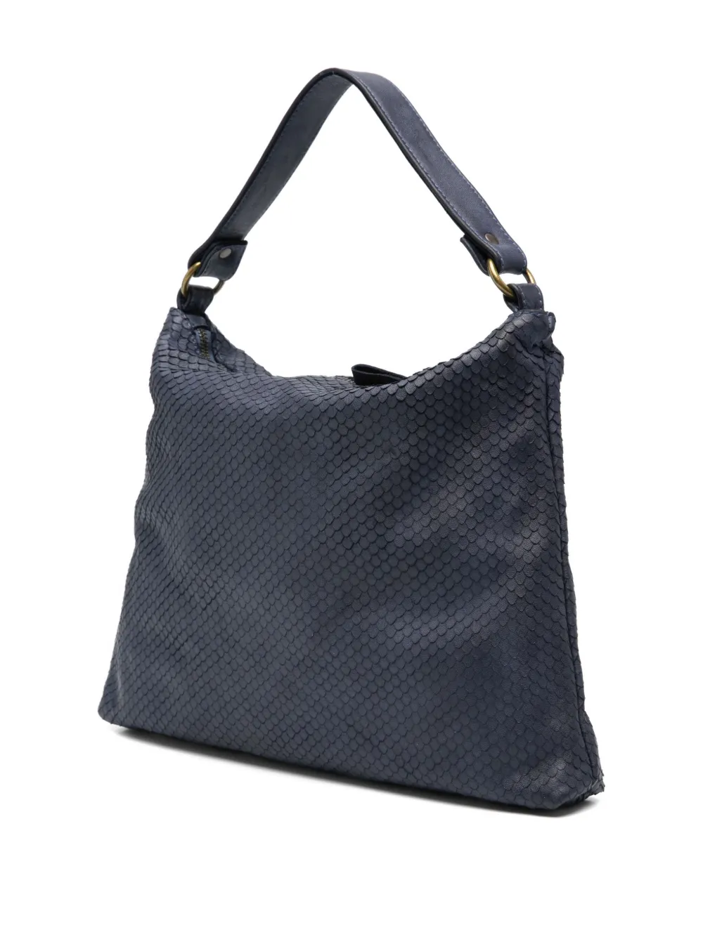 синяя сумка с текстурированной отделкой, верхней ручкой, застежкой-молнией сверху, съемным регулируемым плечевым ремнем, внутренней нашивкой с логотипом
