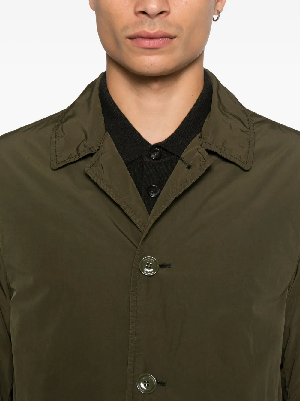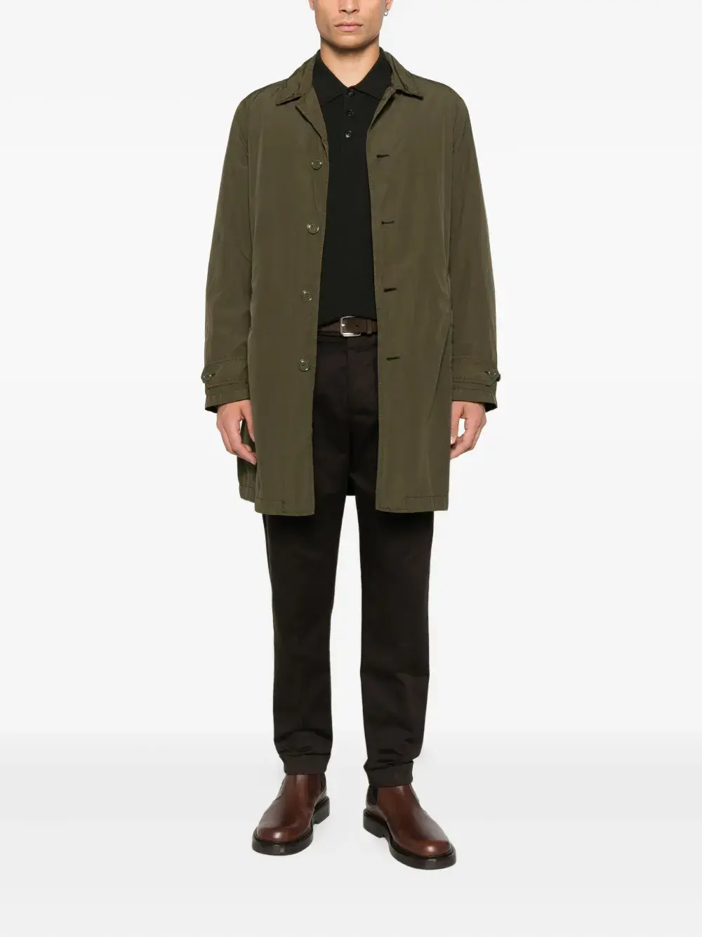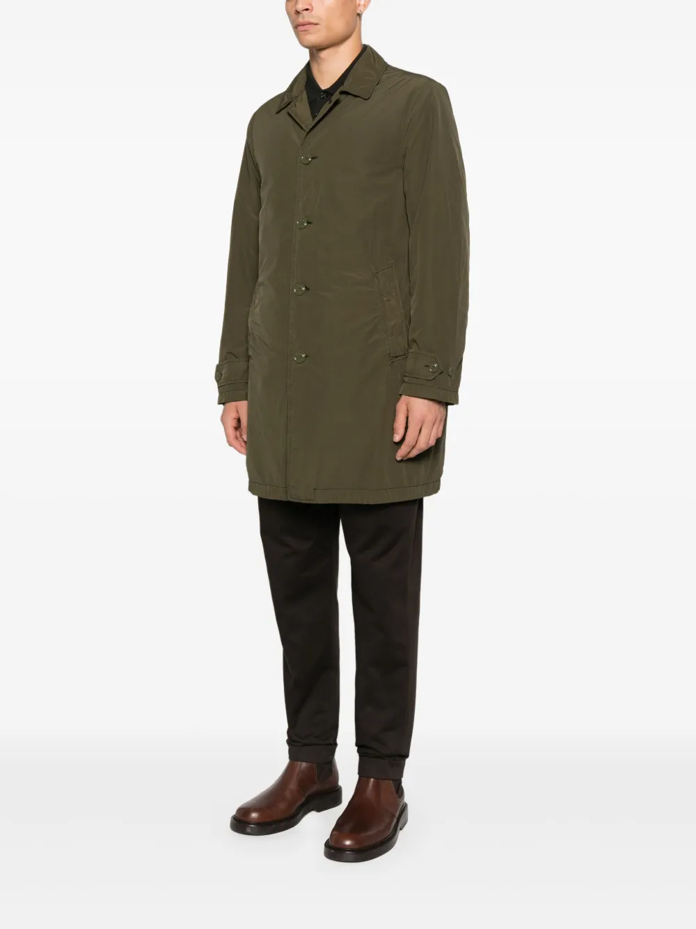 хаки, застежка на пуговицы спереди, прорезные карманы, манжеты с ремешками, классический воротник, прямой низ