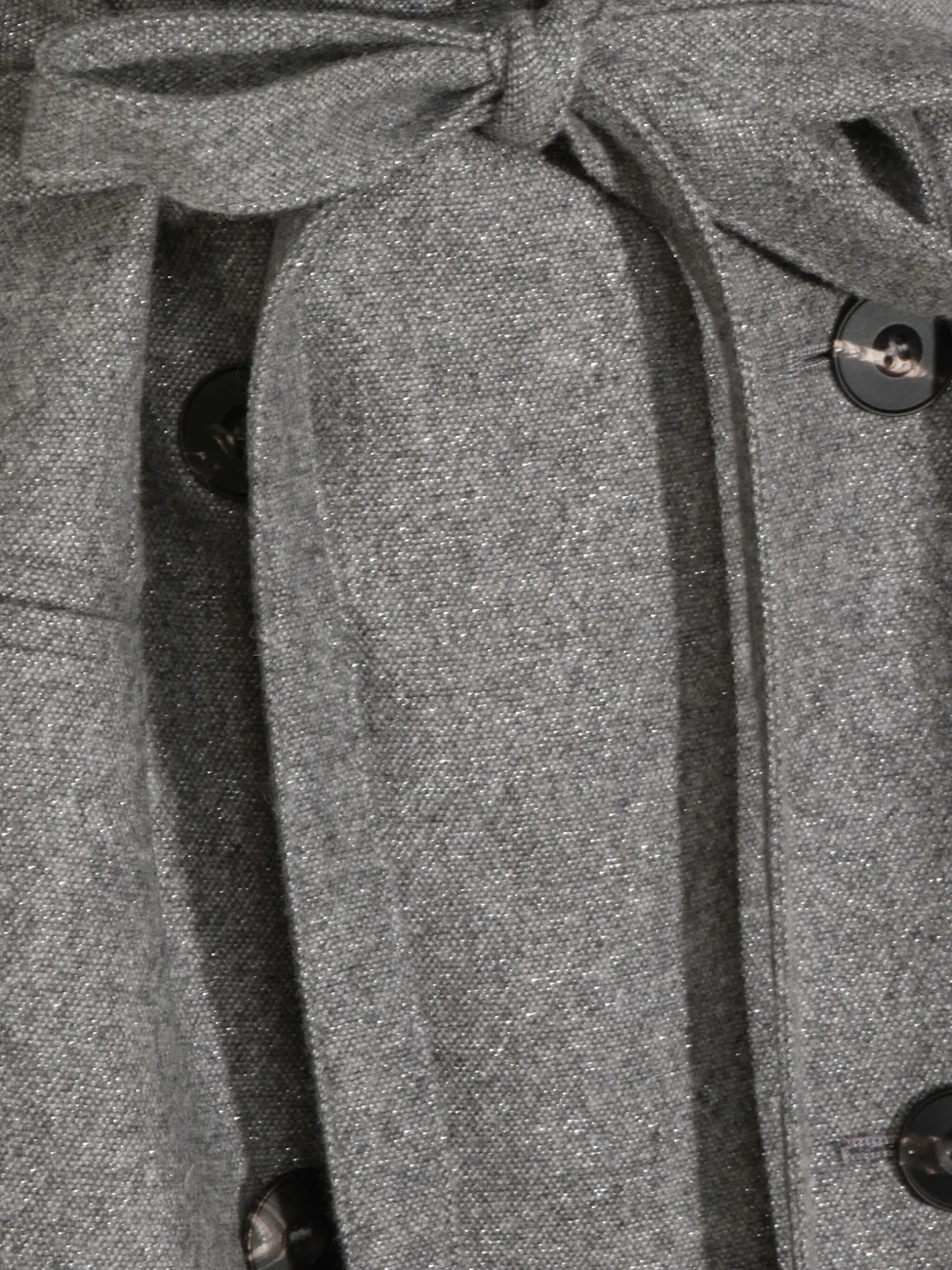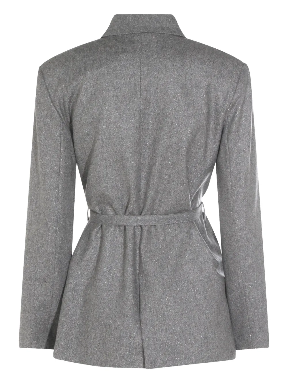 серый двубортный пиджак с заостренными лацканами, поясом на завязке, застежкой на пуговицы и длинными рукавами