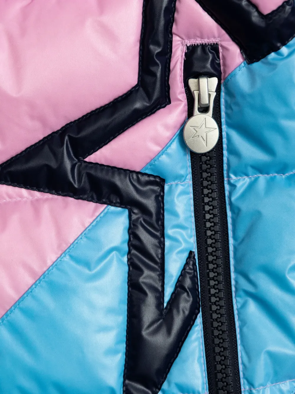 светло-розовый/голубой узор «шеврон» с логотипом, стёганый дизайн, несъёмный капюшон, застёжка на молнии, длинные рукава, боковые карманы на молнии