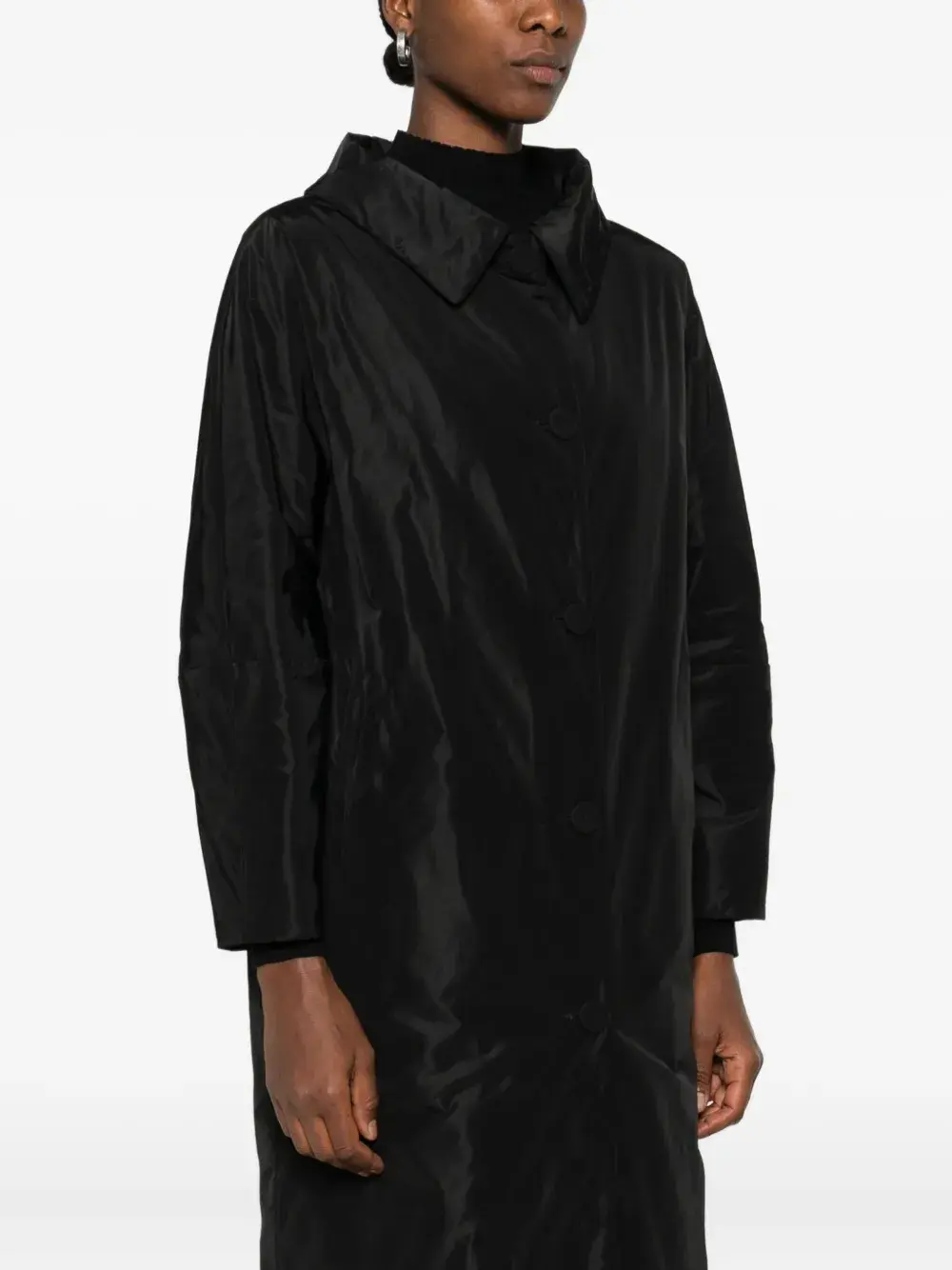 чёрный, застёжка на пуговицы, длинные рукава, прямой низ, передние прорезные карманы