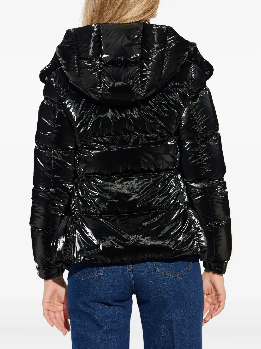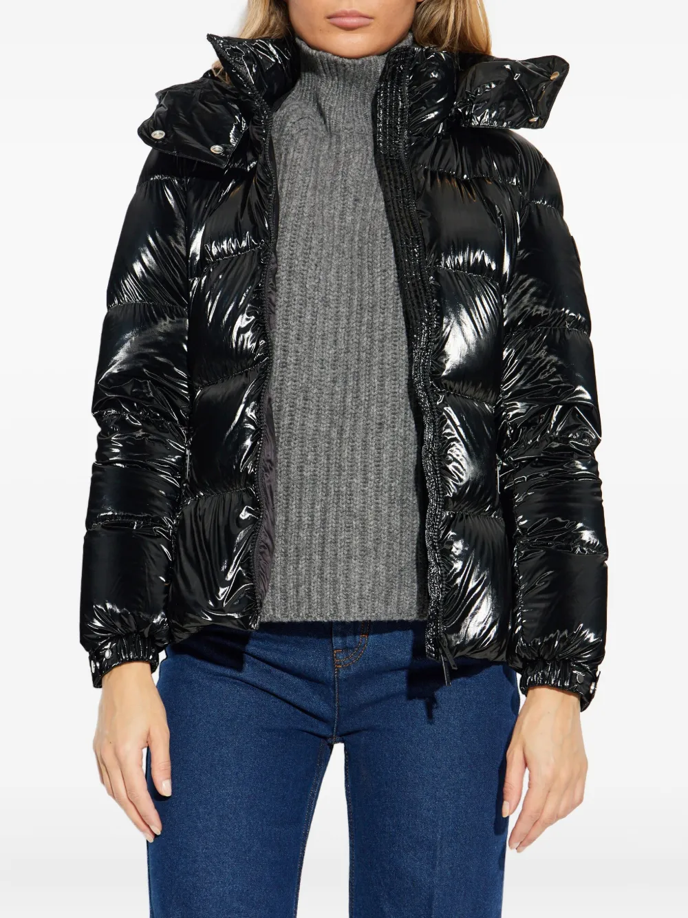 черная стеганая модель с капюшоном, застежкой-молнией и кнопками