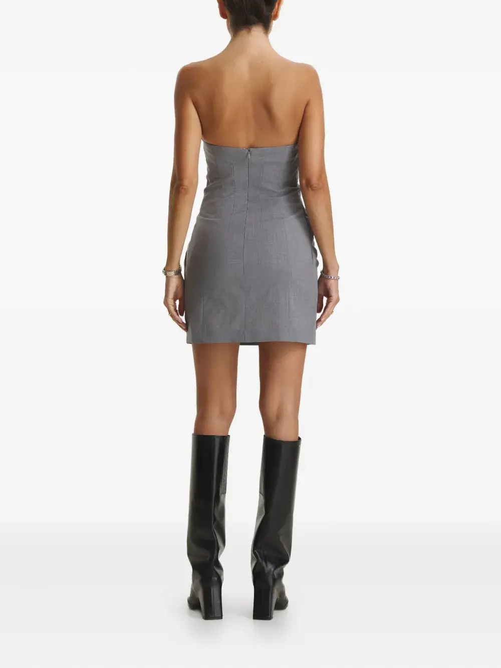 серое платье без бретелек с драпировкой, мини-длины, скрытая застежка-молния, панельная конструкция