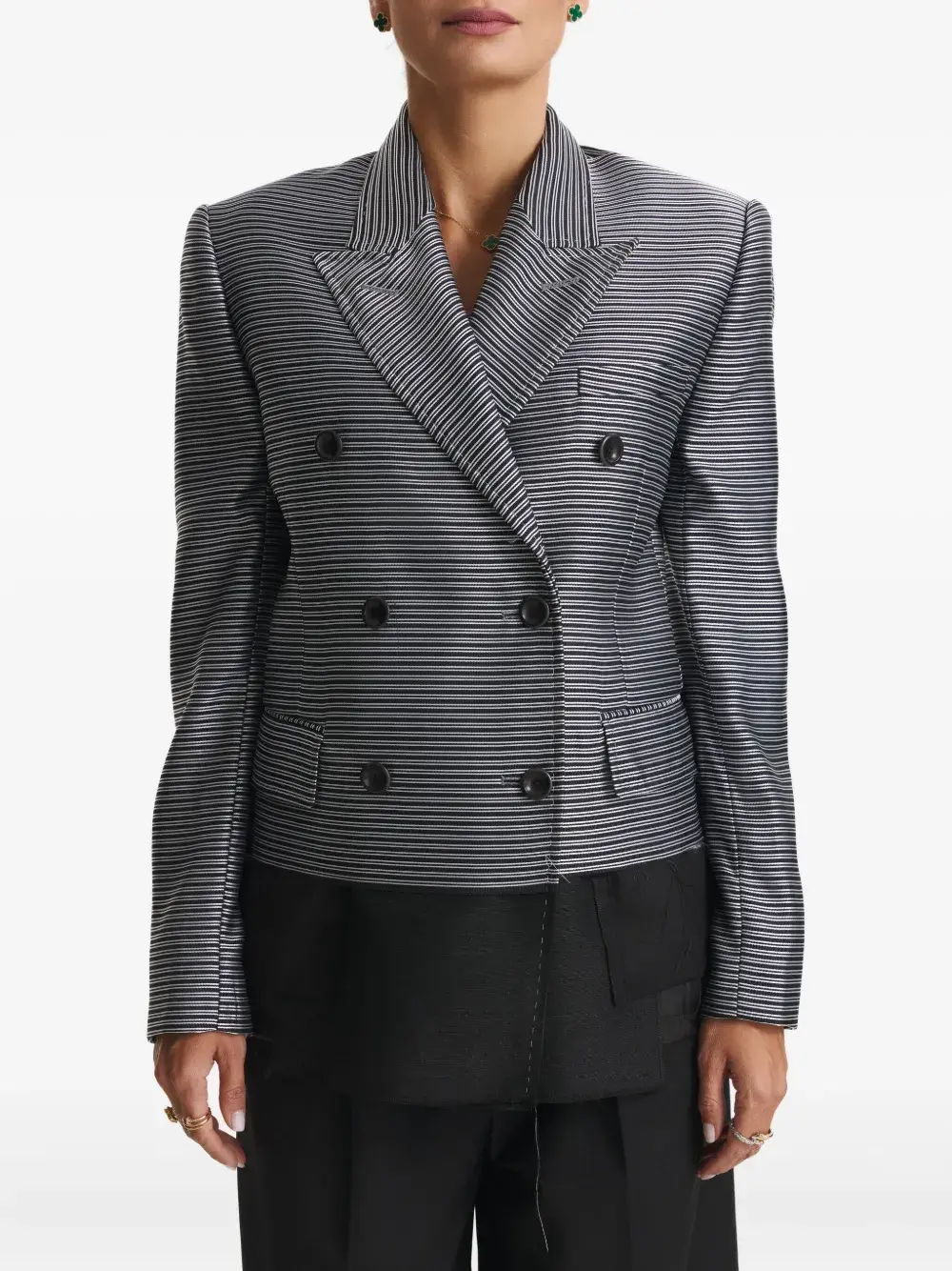 серый полосатый двубортный пиджак с застежкой на пуговицы, клапанами на карманах и панельной конструкцией