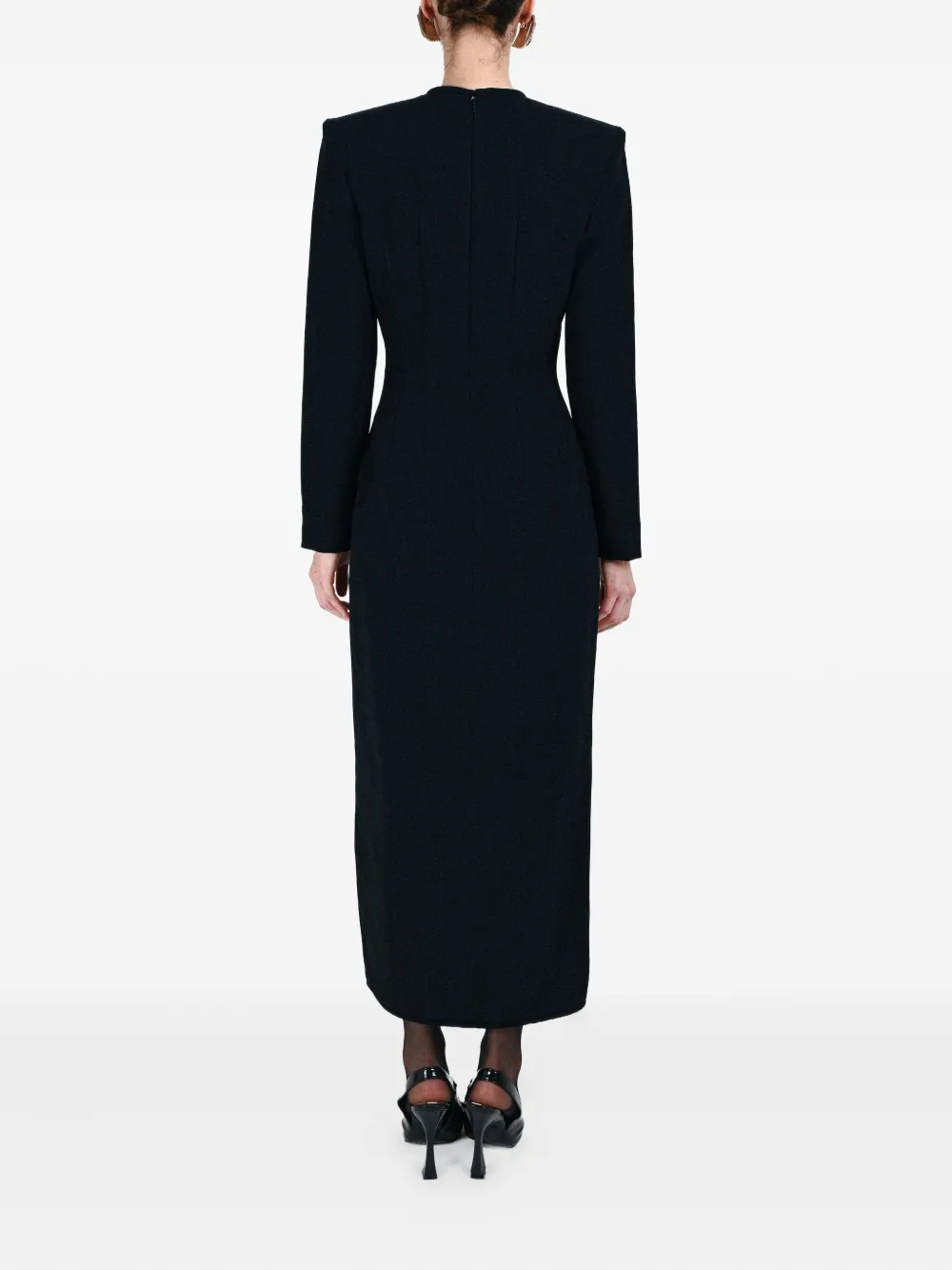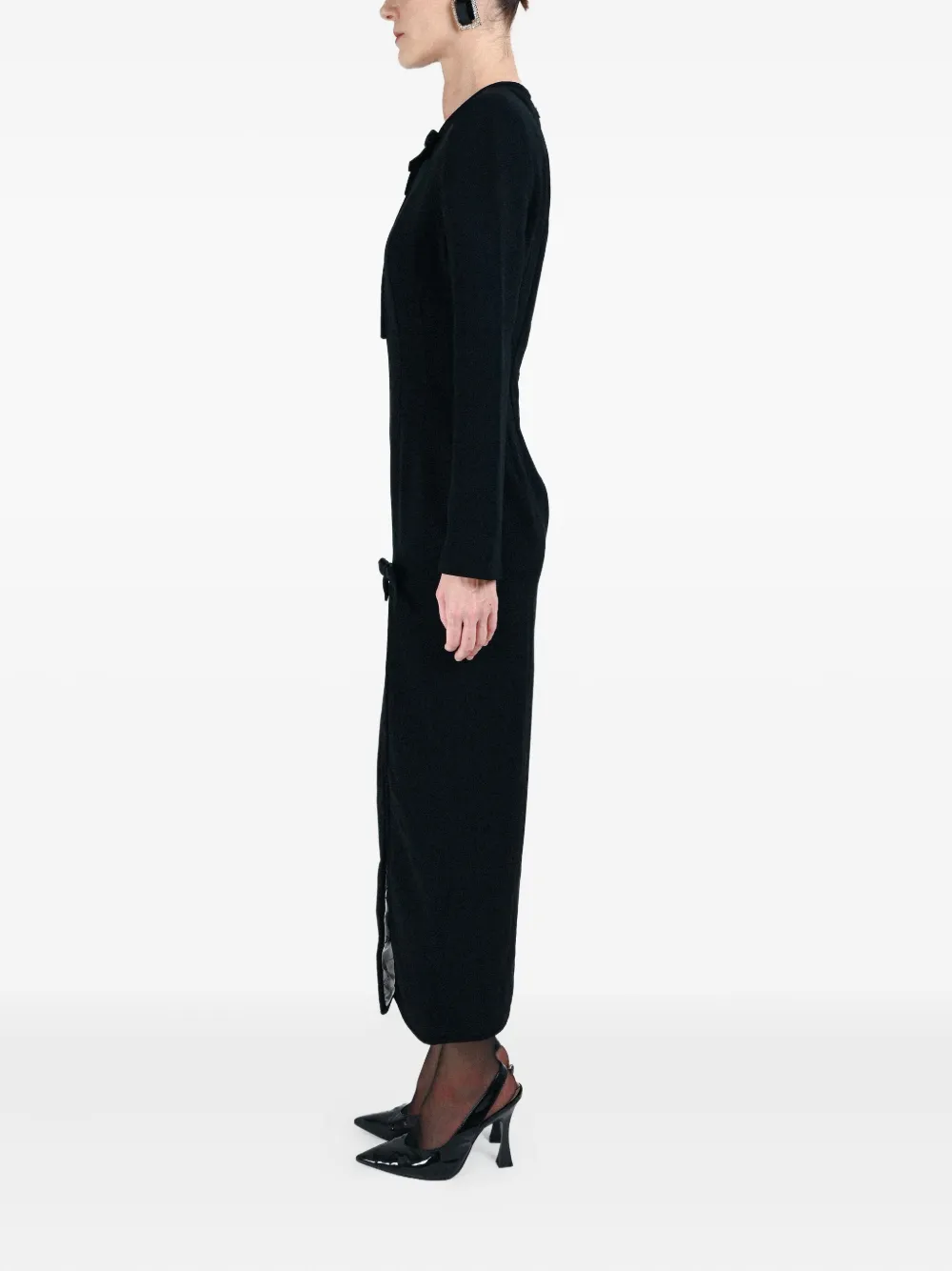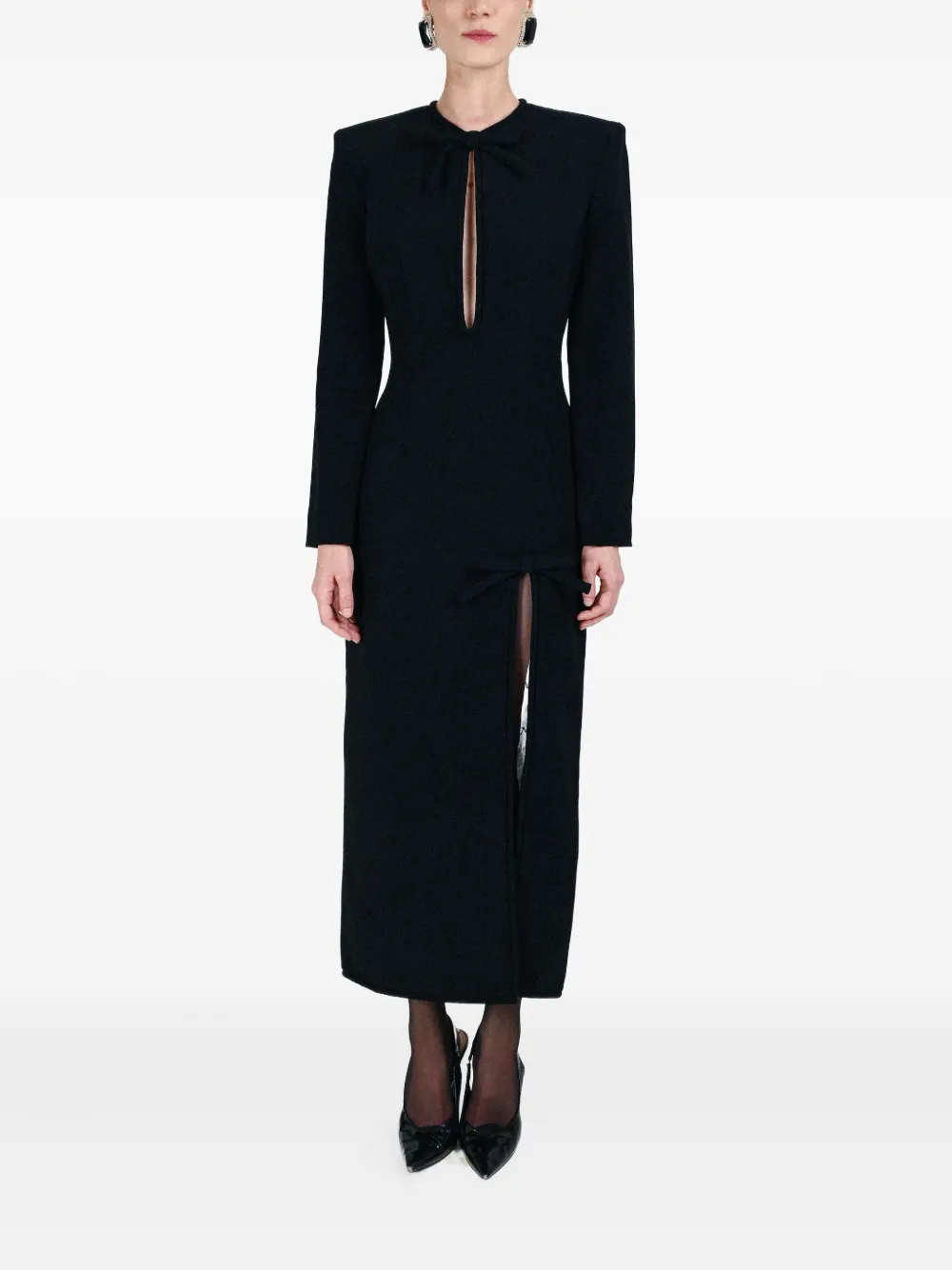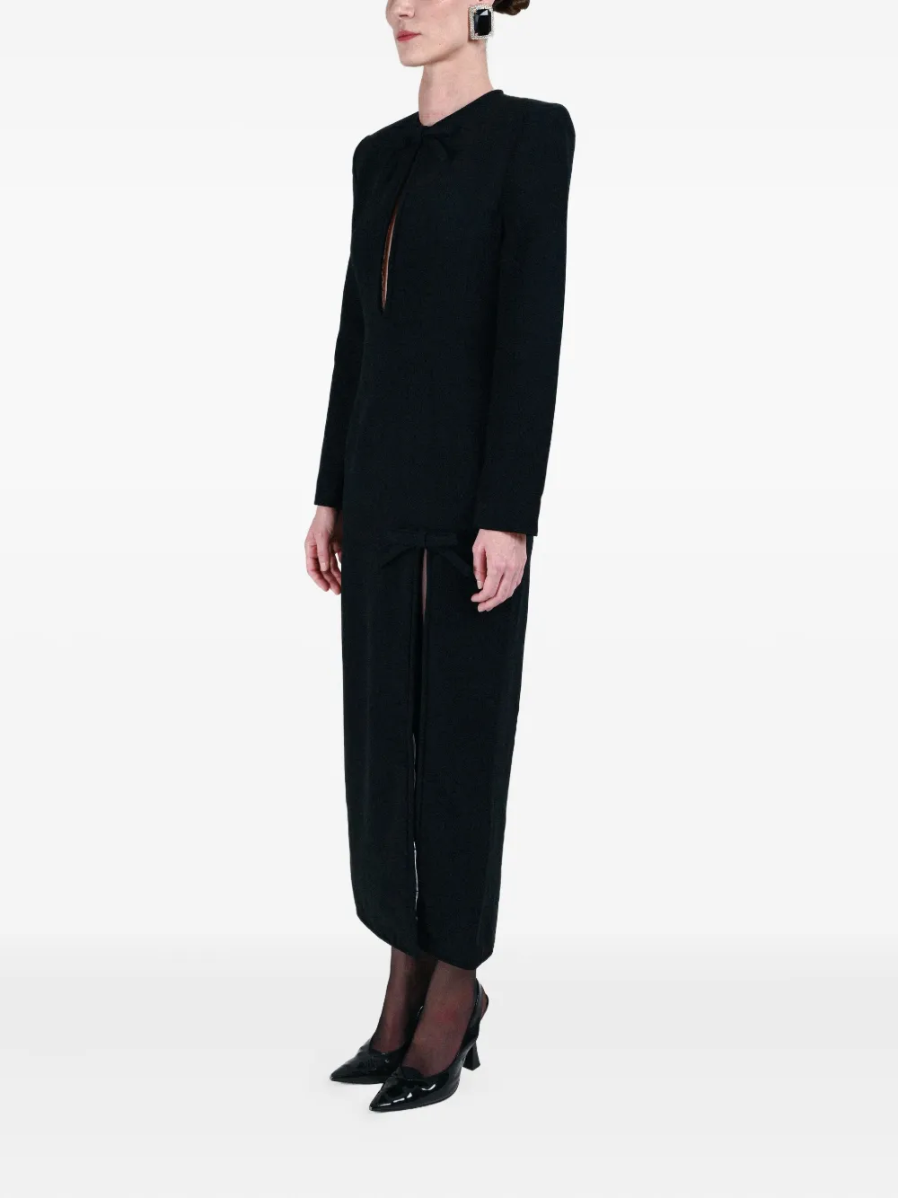 чёрное платье с бантом, разрезом спереди и длинными рукавами