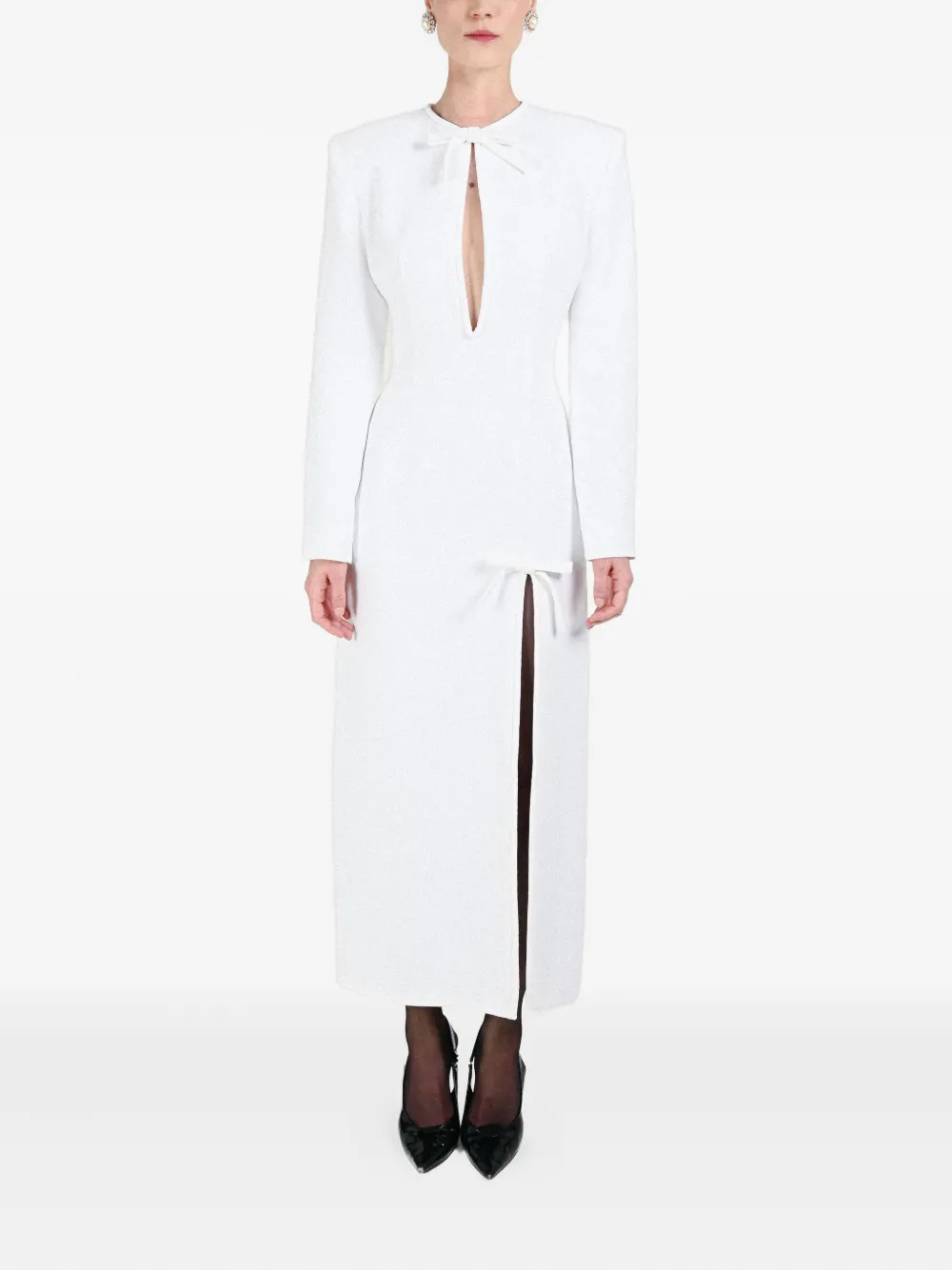 белый цвет, бантовый декор, длинные рукава, разрез спереди, застежка-молния сзади