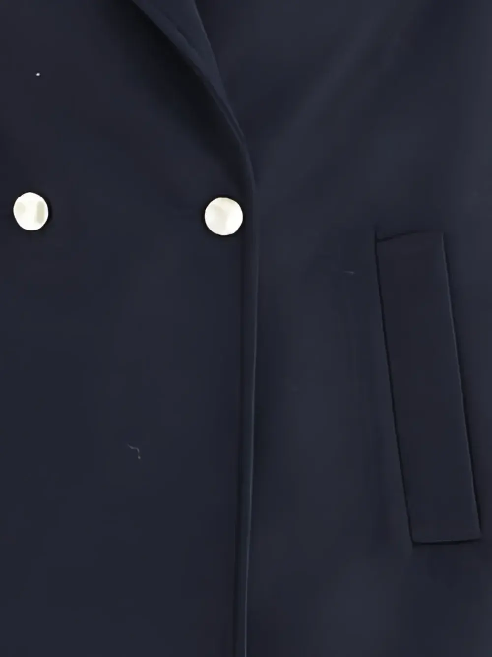 темно-синий двубортный пиджак, пуговицы под серебро, лацканы с вырезом, отвороты на манжетах, боковые прорезные карманы