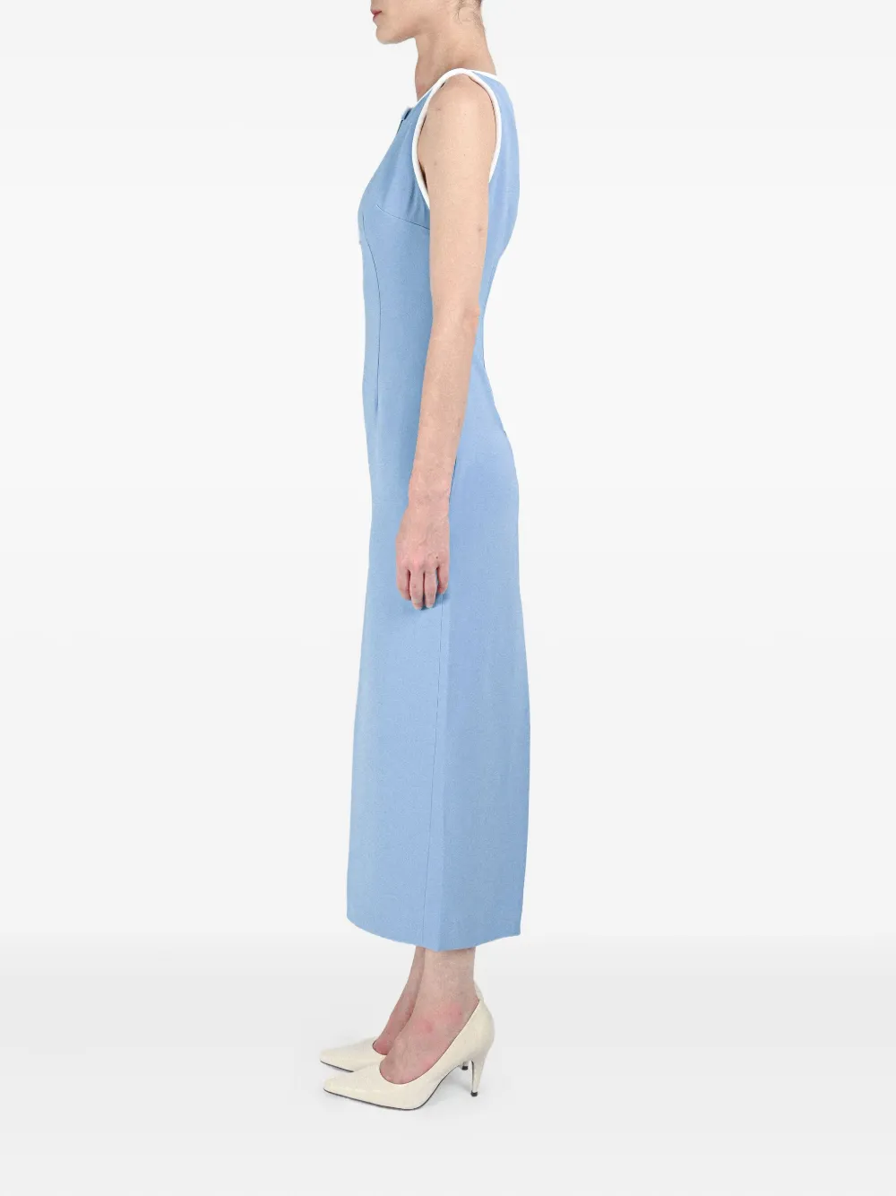 синее платье с прямым вырезом, прорезью, без рукавов, контрастной отделкой и бантом