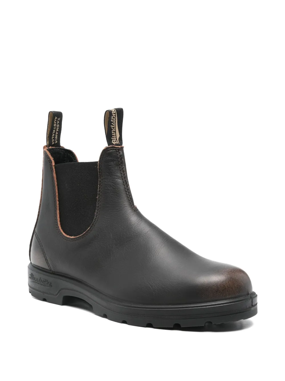 коричневые ботинки с эластичными боковыми вставками, петлей для натягивания, рифленой резиновой подошвой и круглым носком
