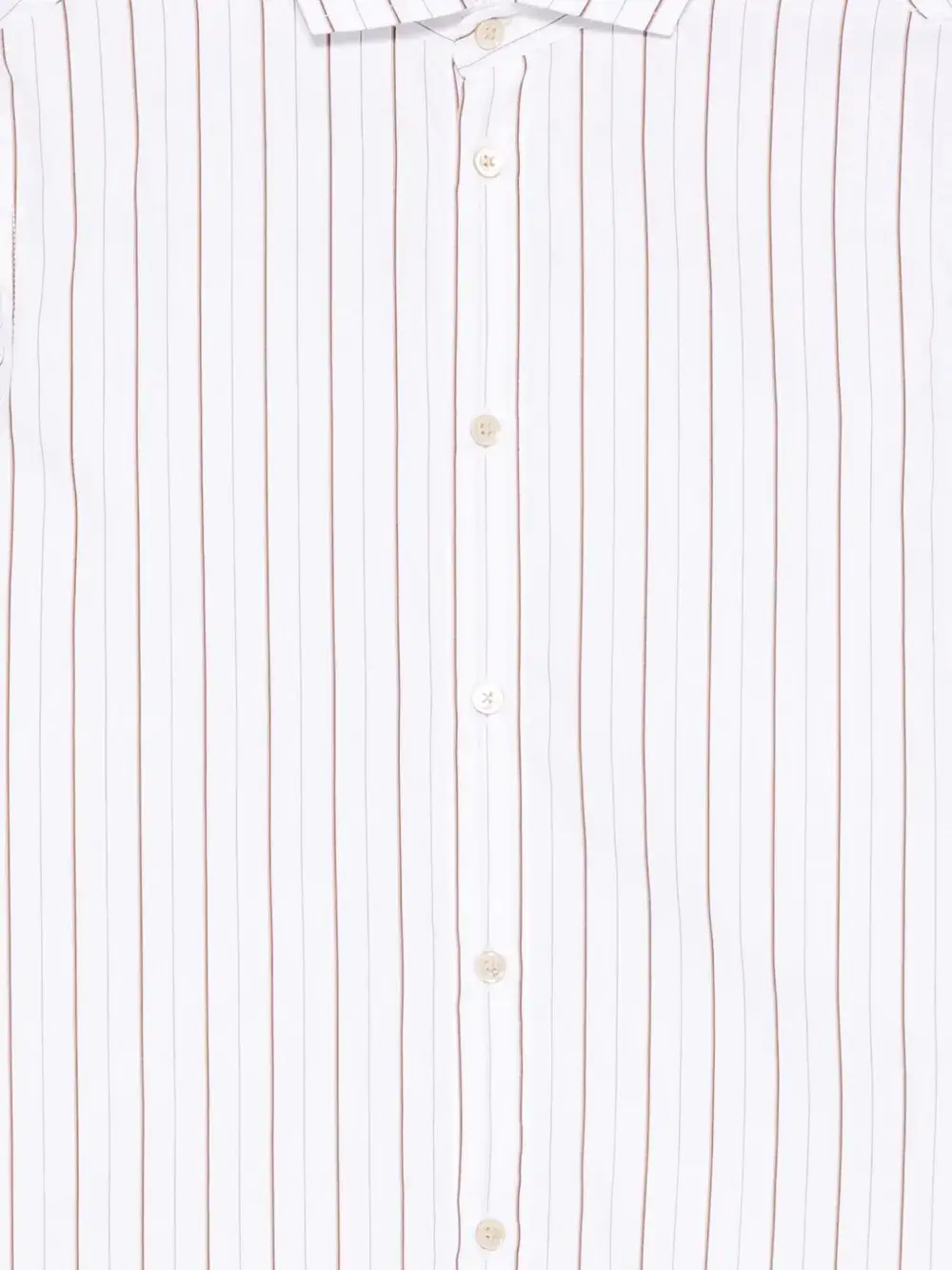 белый с полосатым узором, застёжка на пуговицы, длинные рукава, манжеты на пуговицах, заострённый воротник