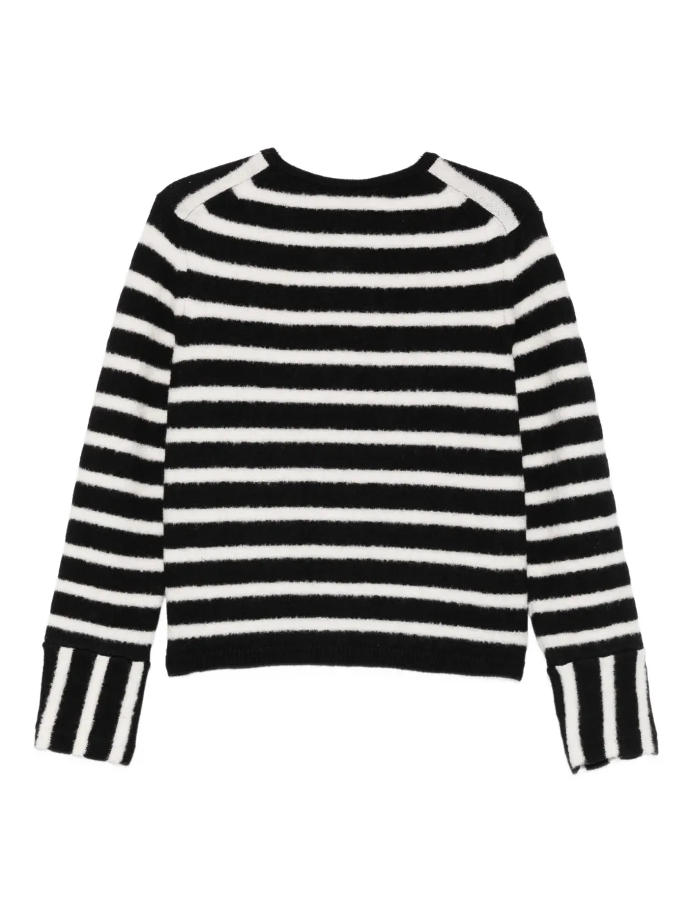чёрный с полосатым дизайном, застёжка на пуговицы, два передних кармана, круглый вырез, длинные рукава