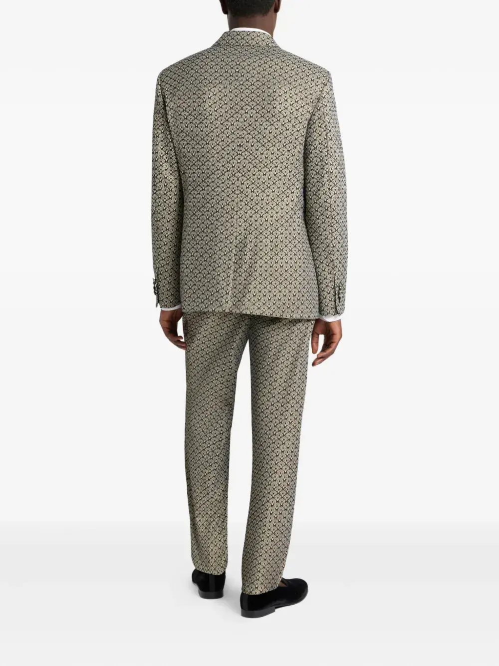 бежевый двубортный пиджак с прорезными карманами, лейблом с логотипом и лацканами с острыми концами