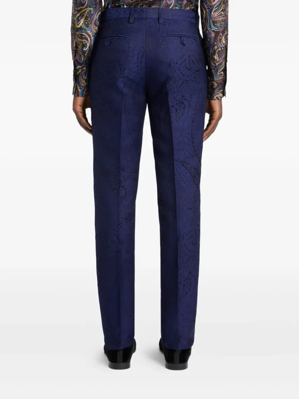 синий ремень с рисунком «пейсли», шлевки для ремня, задний прорезной карман, потайная застежка на молнию и пуговицу