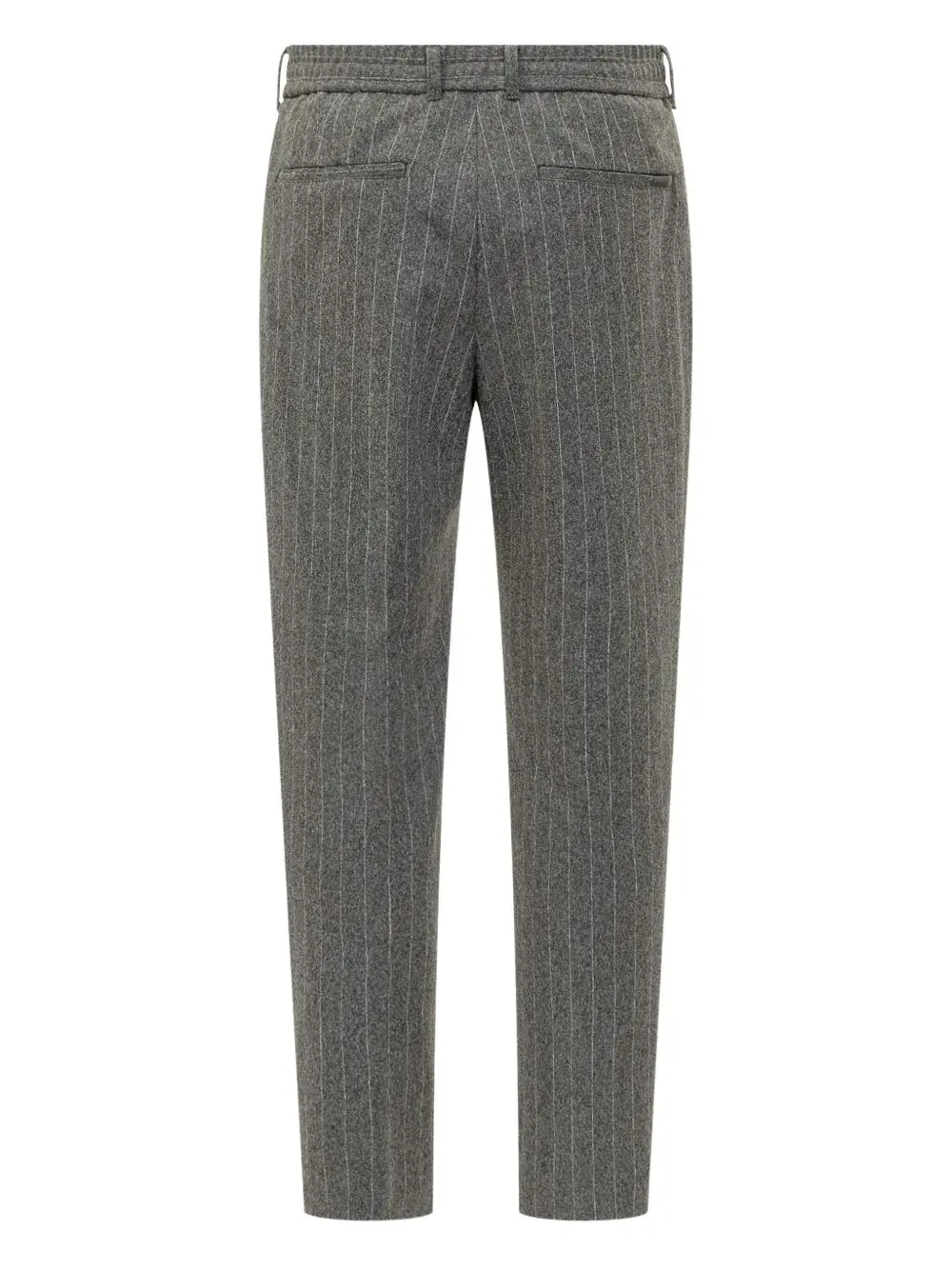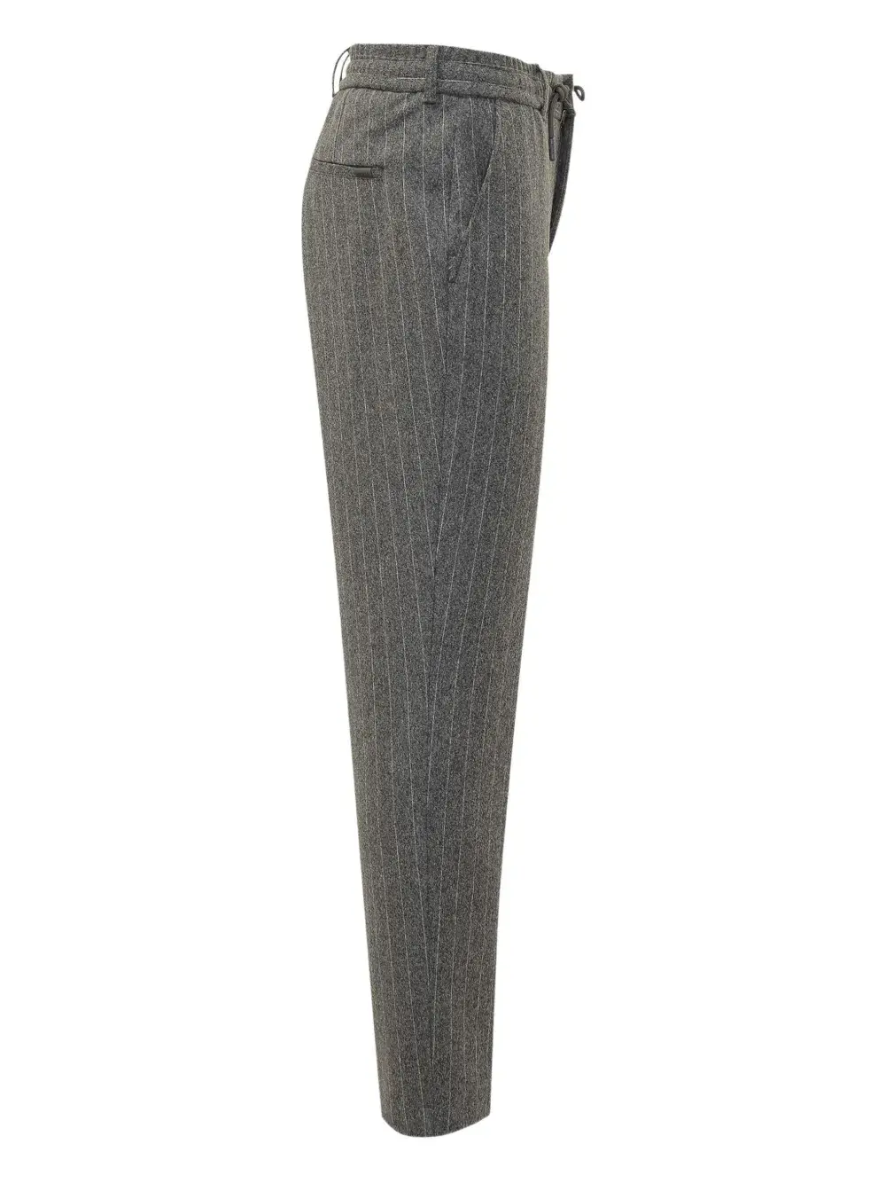 средне-серый цвет с узором в тонкую полоску, эластичный пояс на завязках, шлевки для ремня, задний прорезной карман, боковые карманы в швах