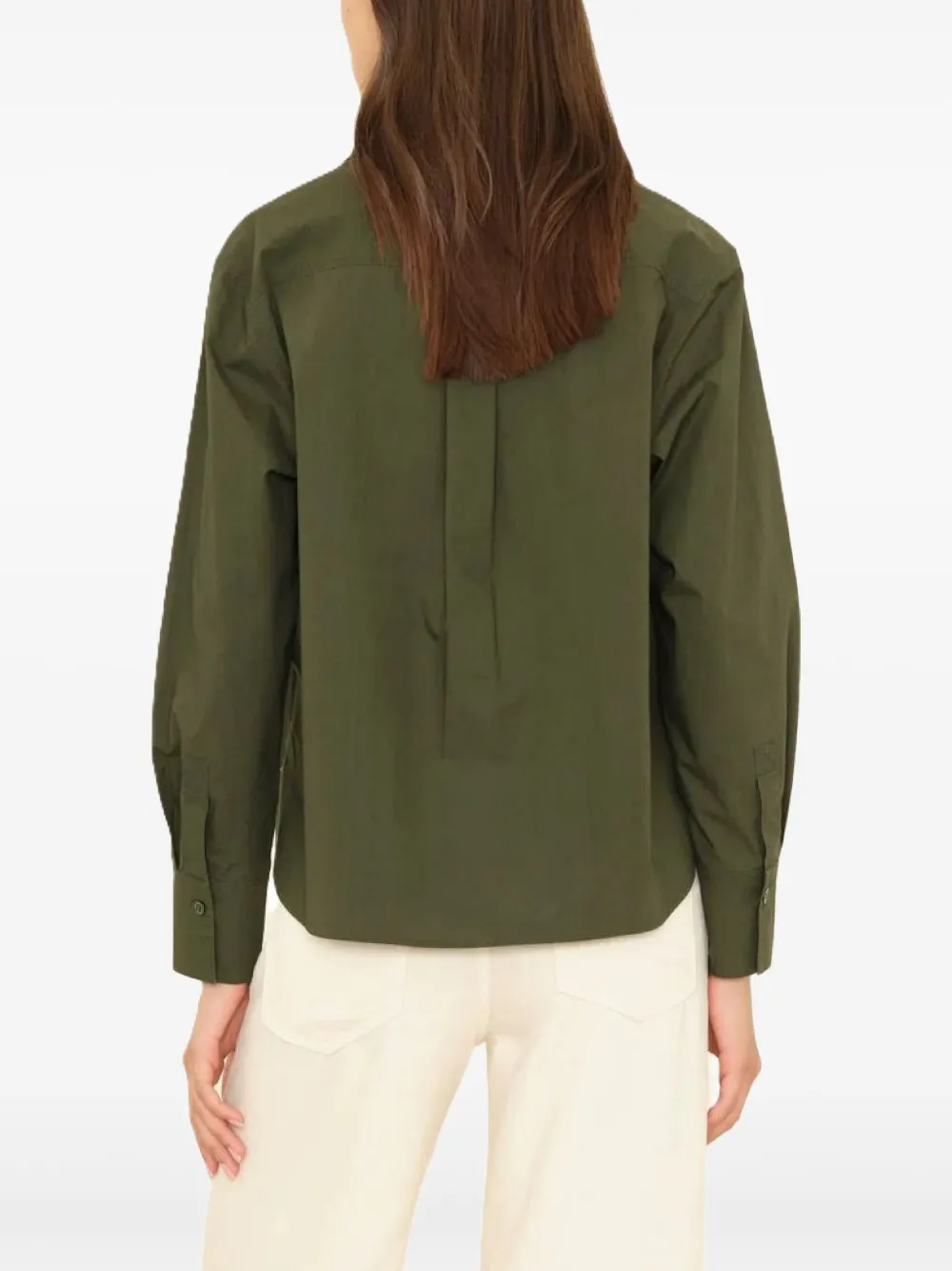 зеленая полосатая рубашка с застёжкой на пуговицы, длинными рукавами, нагрудным карманом и манжетами на пуговицах
