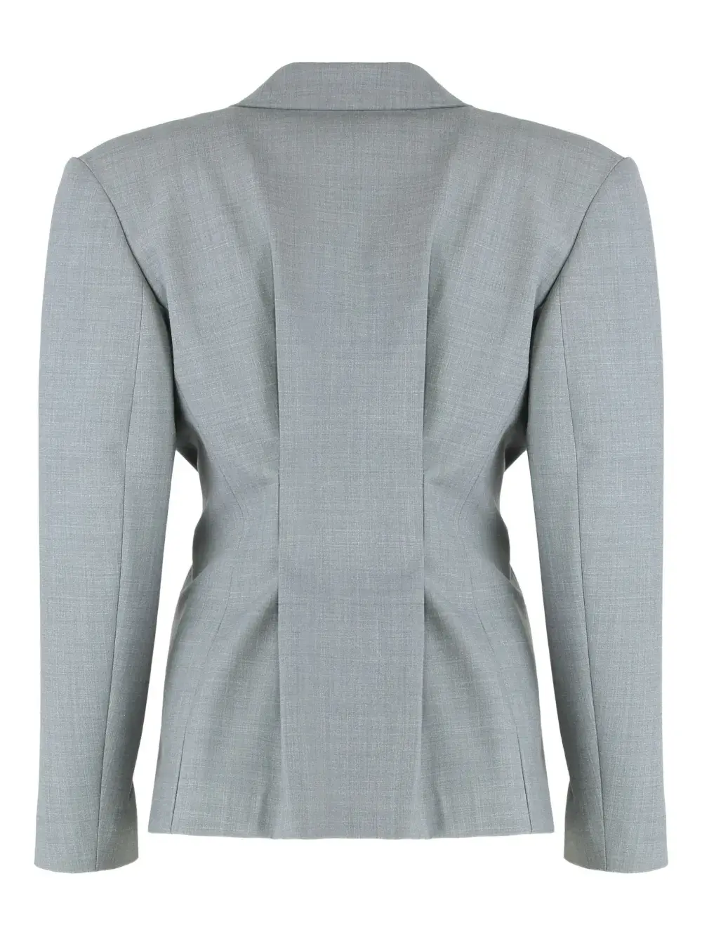 Светло-серый однобортный пиджак с одной пуговицей, лацканами с вырезом, складками и длинными рукавами