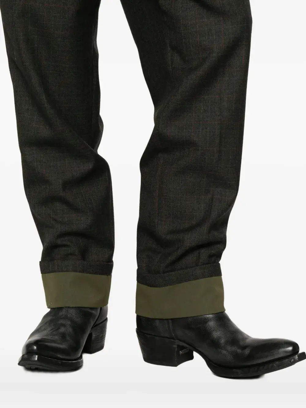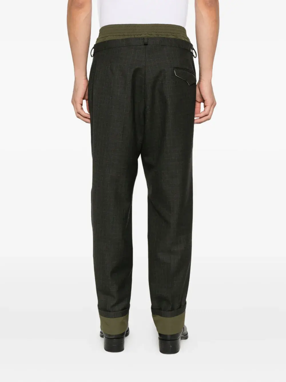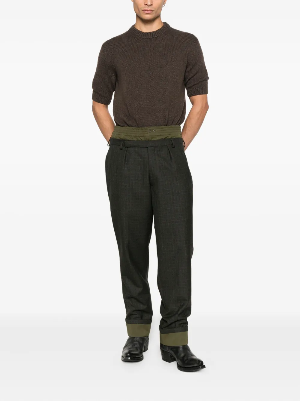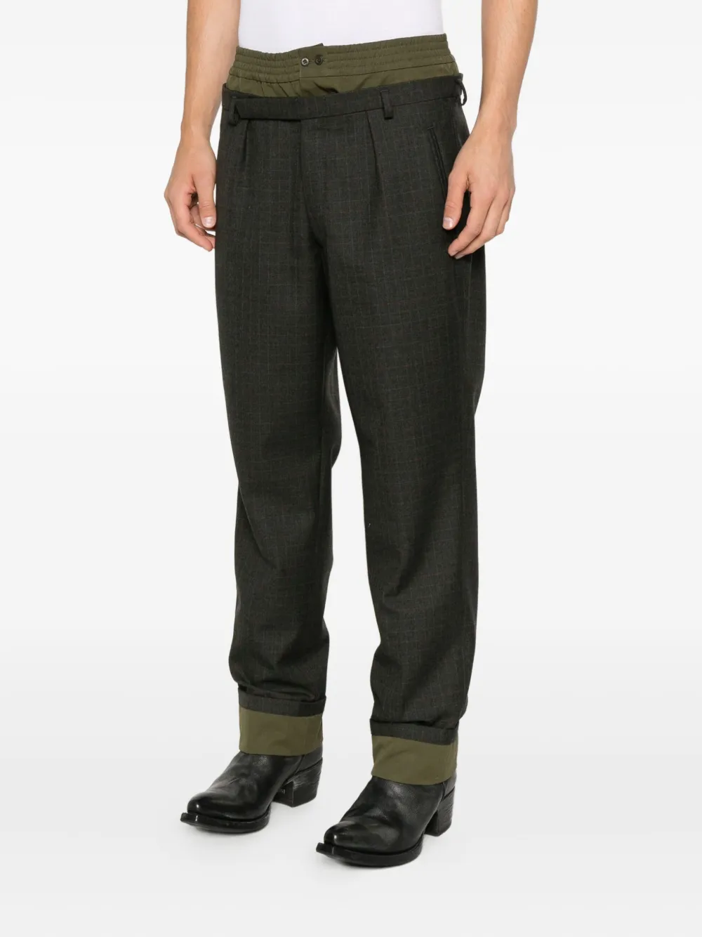 темно-зеленый цвет, клетчатый рисунок, эластичный пояс, шлевки для ремня, складки