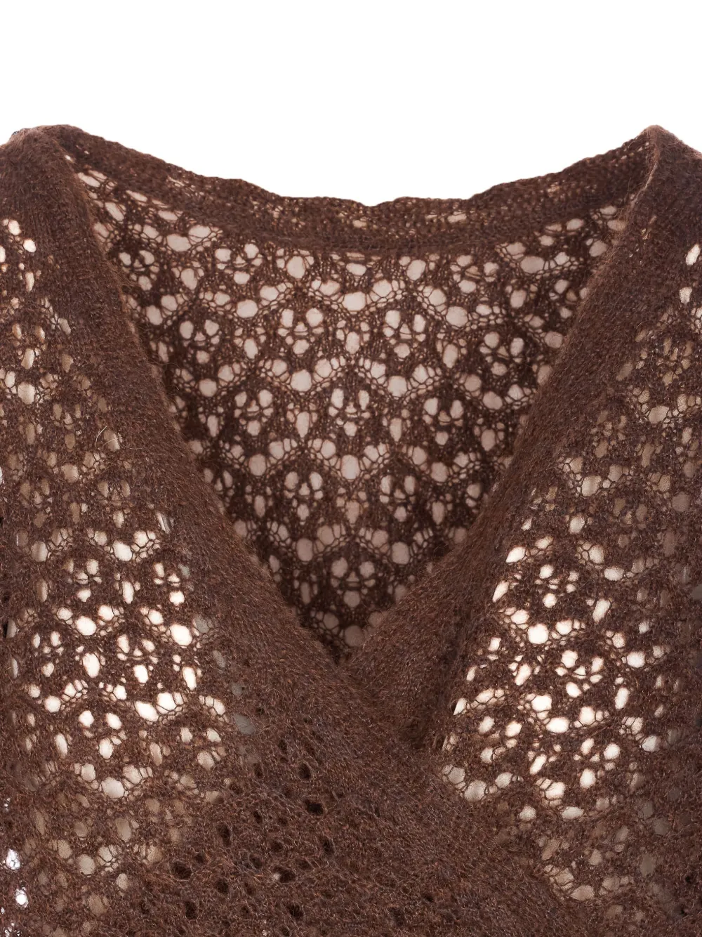 коричневый цвет, широкий вырез, длинные рукава, фурнитура золотистого оттенка, волнистый (фигурный) край