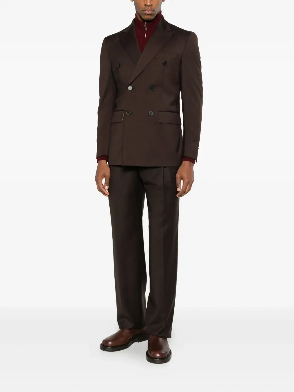темно-коричневый двубортный пиджак с застежкой на пуговицы, лацканами с острыми концами, клапанами на карманах и длинными рукавами