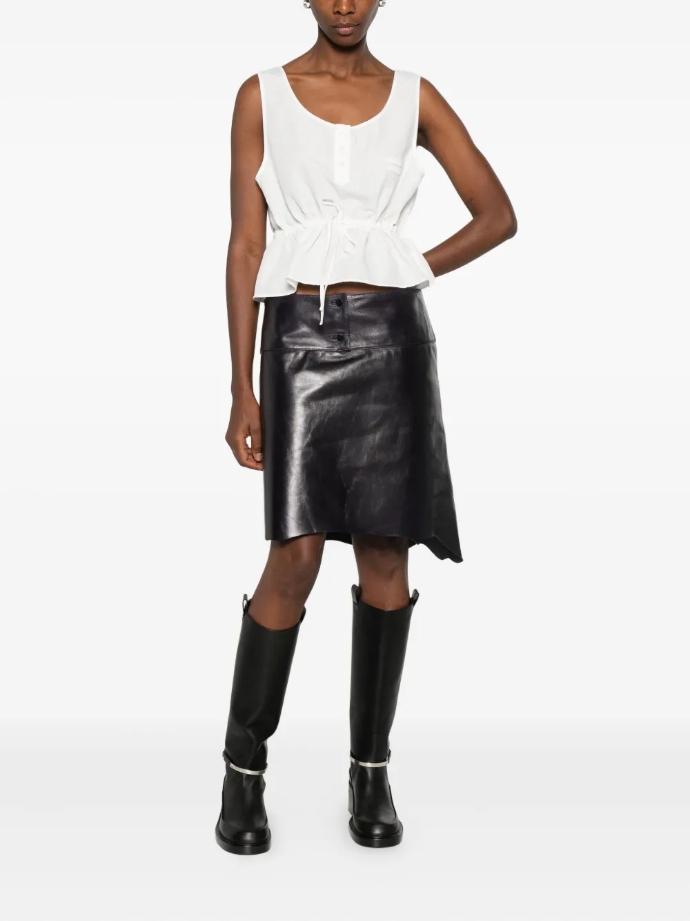 белый топ без рукавов с круглым вырезом, застежкой на пуговицы и утяжкой на талии