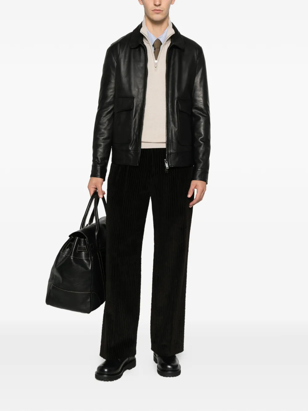 черные прорезные карманы с клапанами, застежка на молнии, отложной воротник, длинные рукава, прямой подол