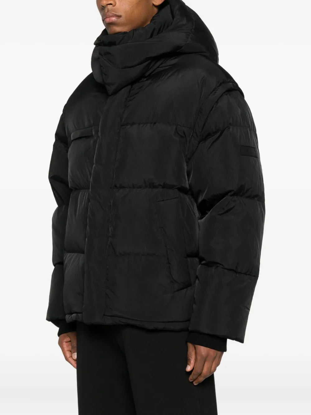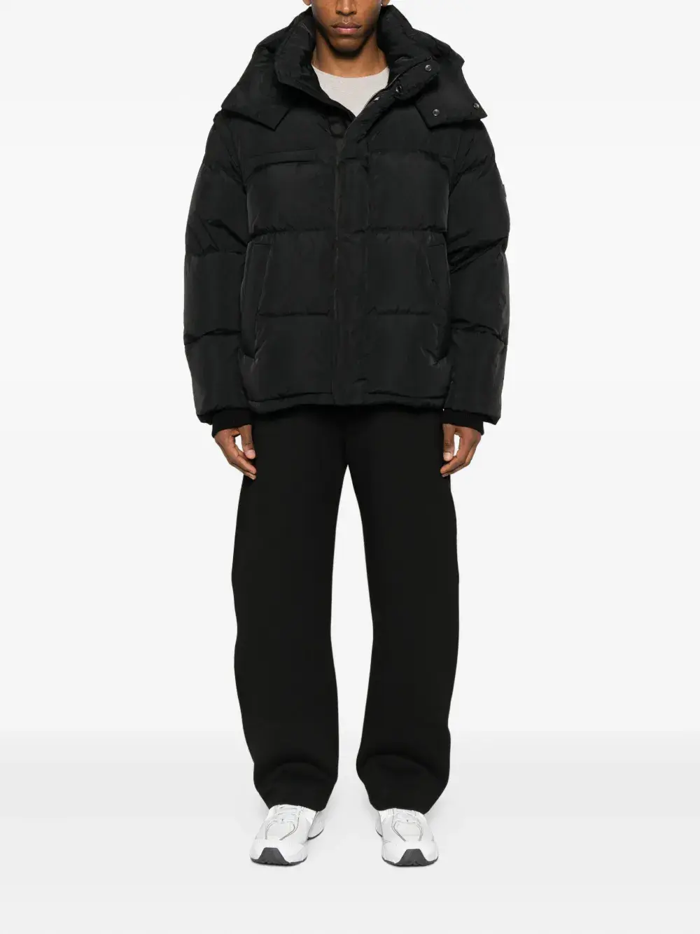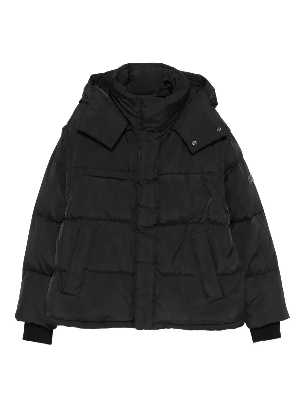 чёрная стёганая куртка с капюшоном, застёжкой спереди и длинными рукавами