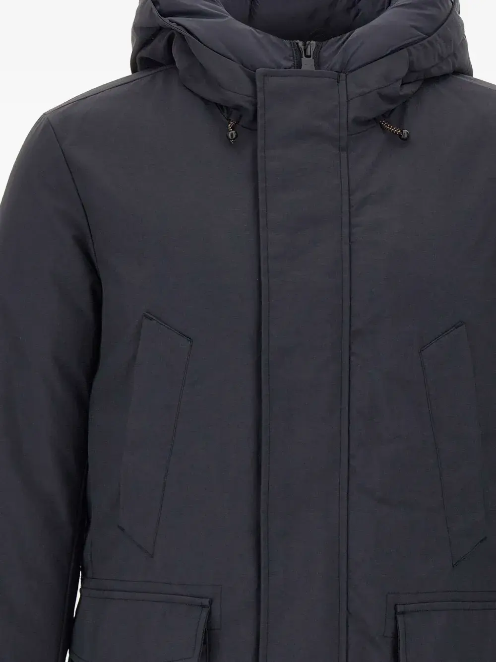 синий стеганый материал, капюшон на завязках, накладные карманы с клапанами спереди, регулируемый кулиской пояс, манжеты с регулировкой на пуговицах