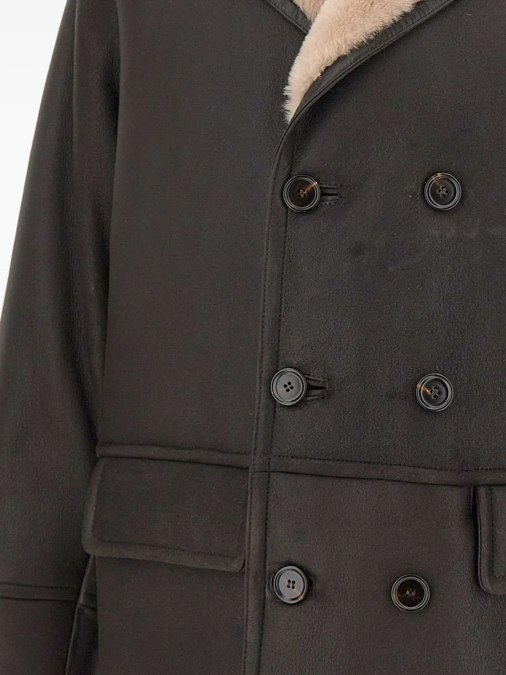 темно-коричневый меховой воротник, застежка на пуговицы, накладные карманы спереди, внутренний карман на молнии