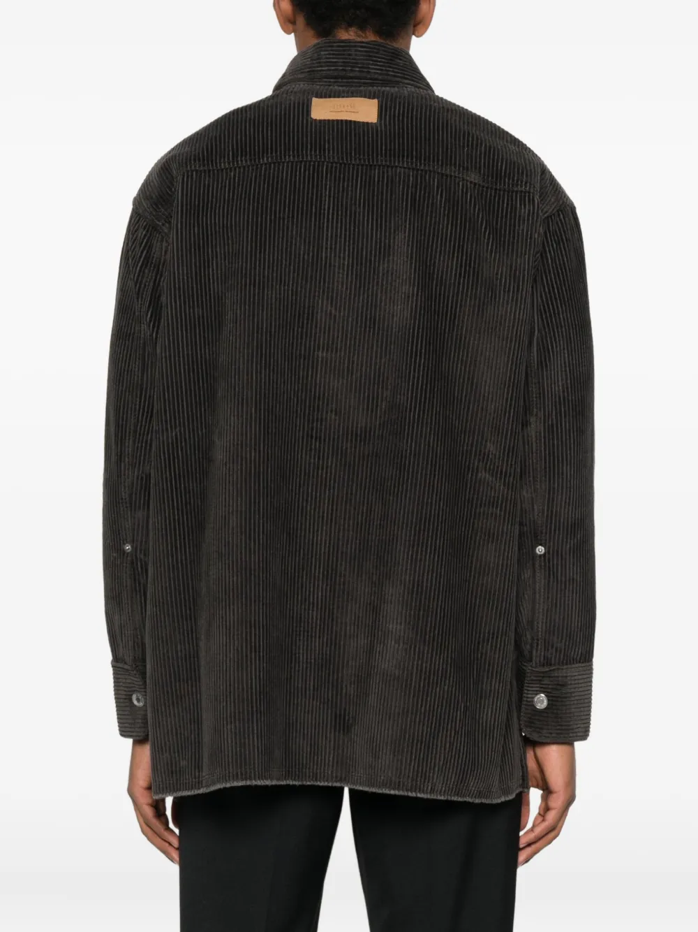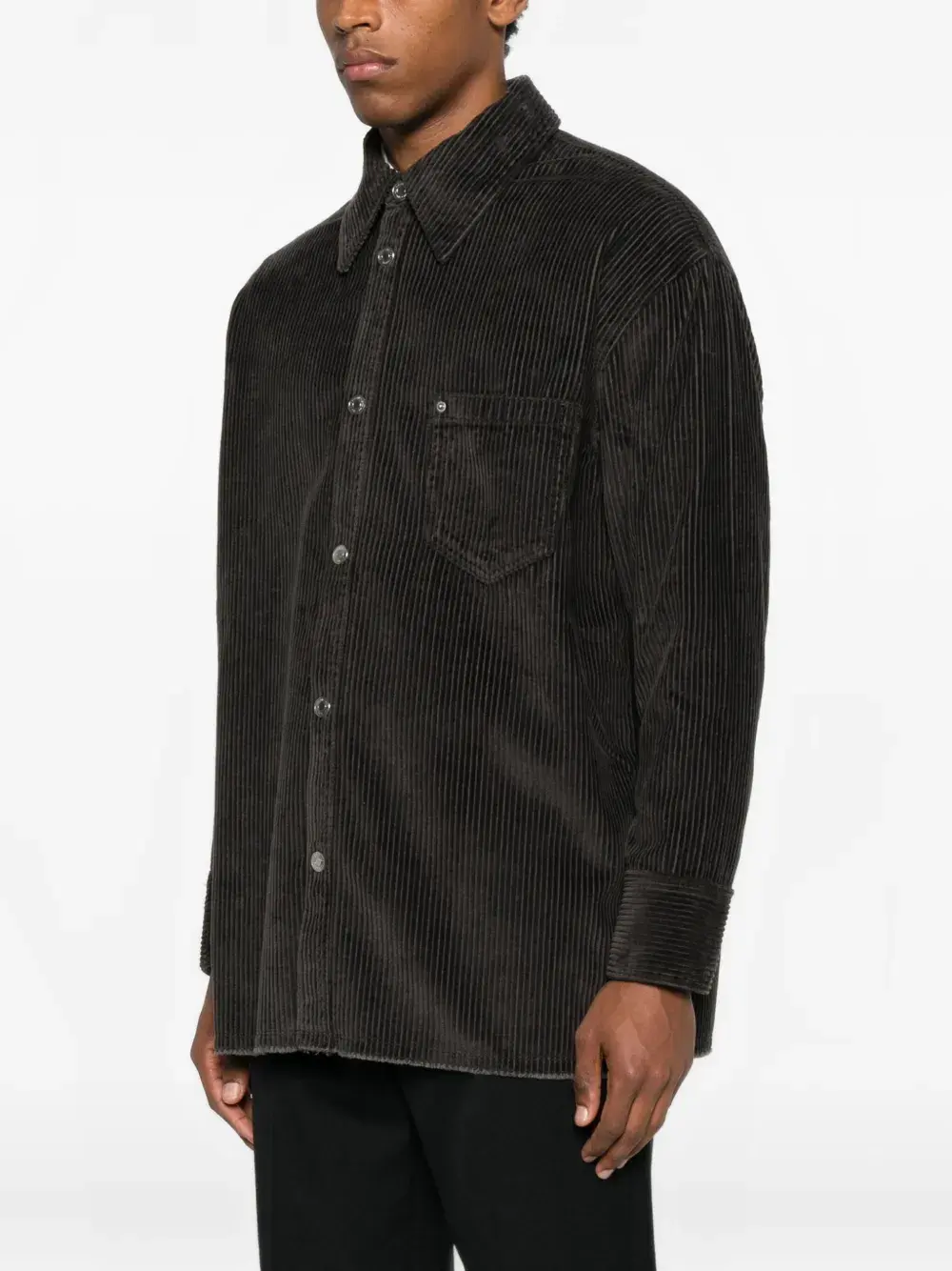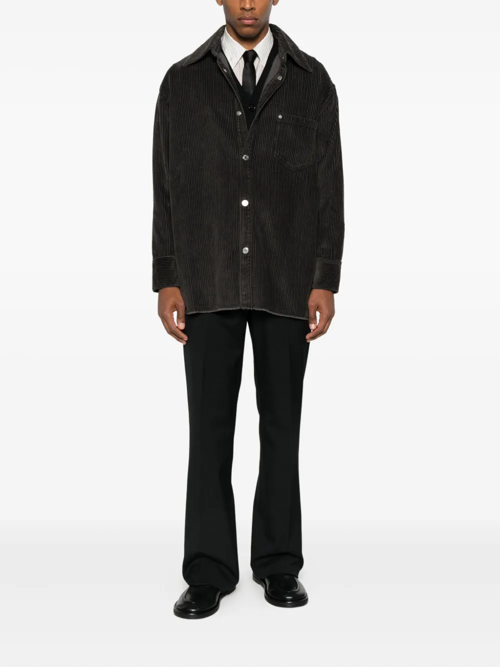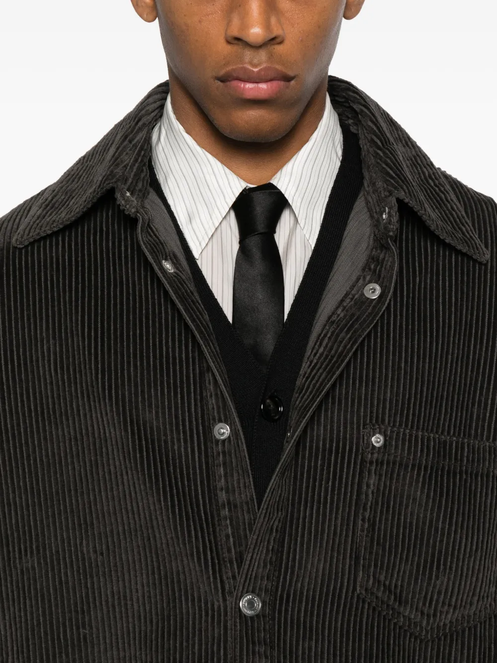 ткань в рубчик цвета антрацит, накладной карман на груди, застежка на пуговицы, длинные рукава, боковые разрезы