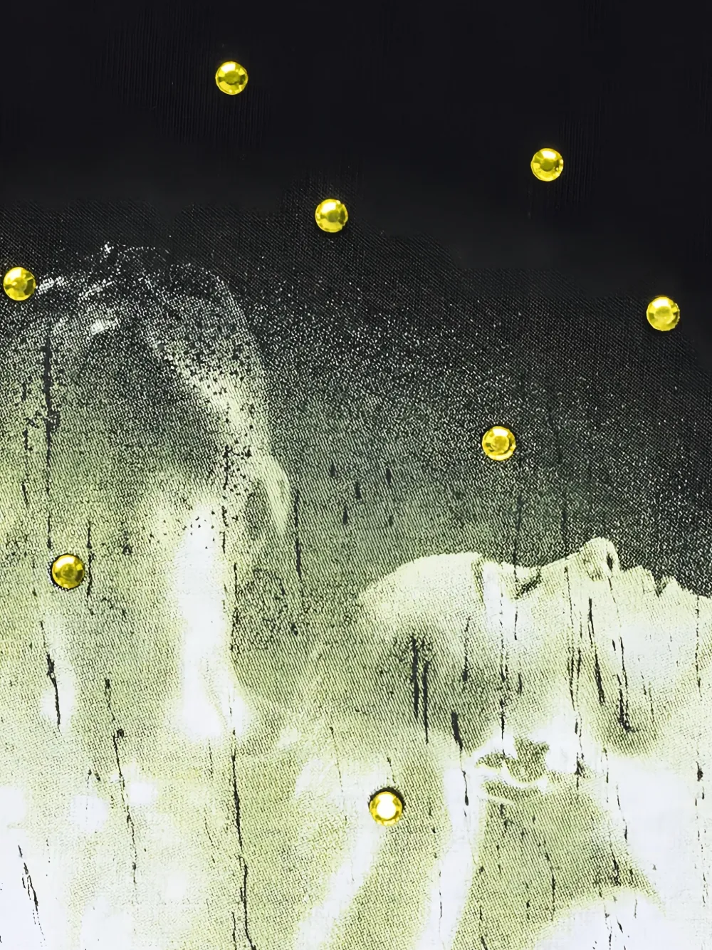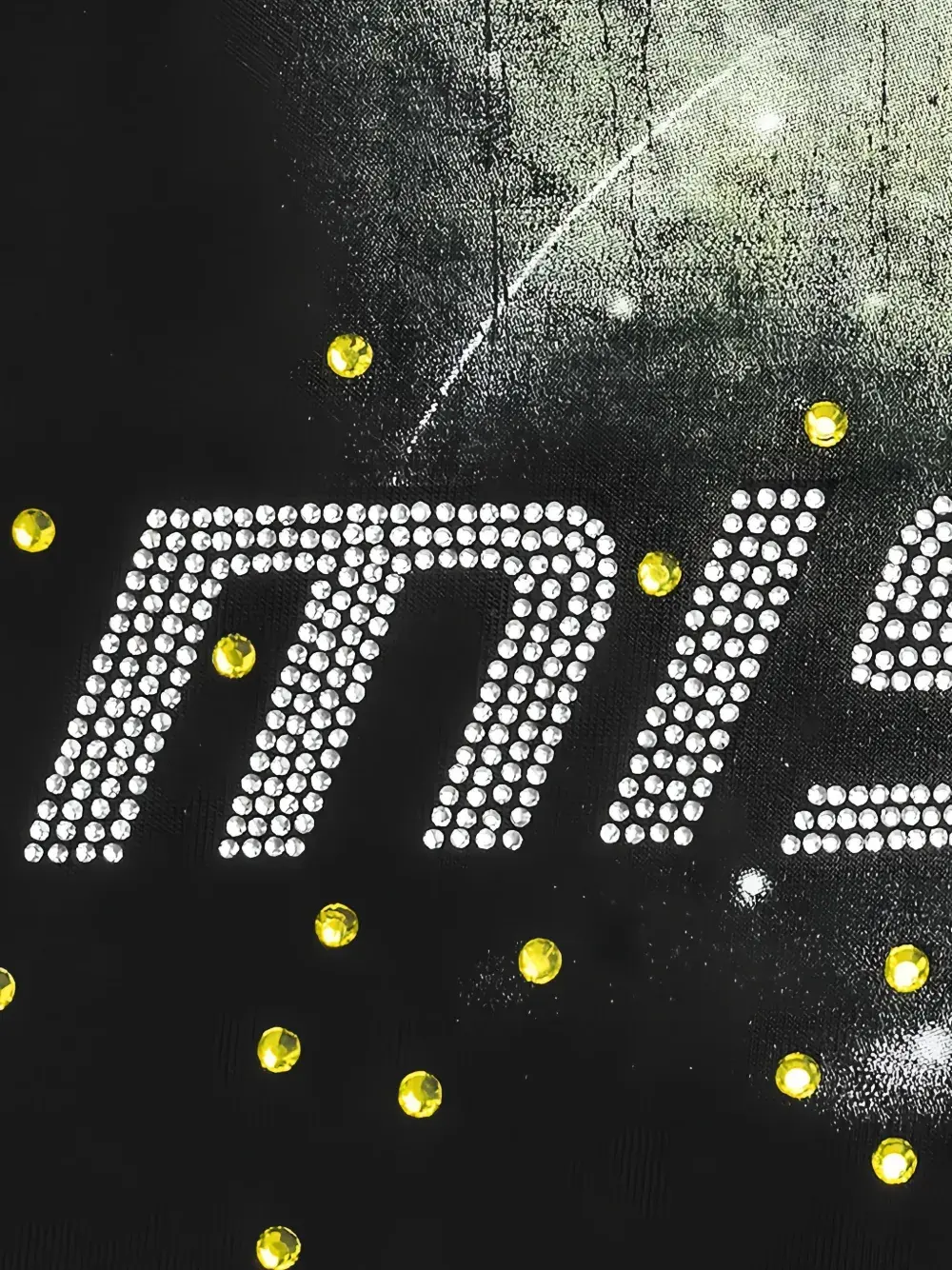 чёрная футболка с круглым вырезом и графическим принтом, украшенная логотипом