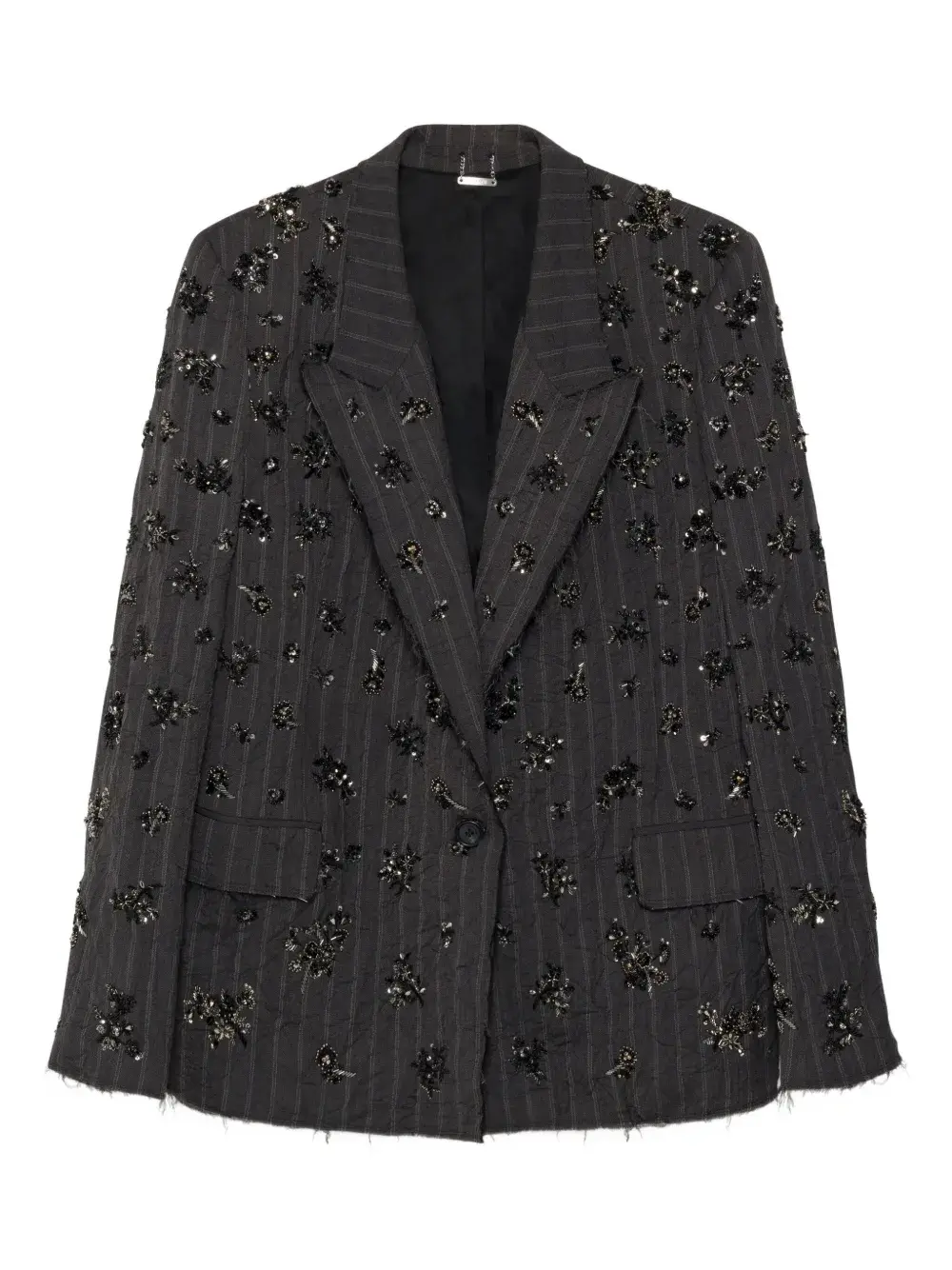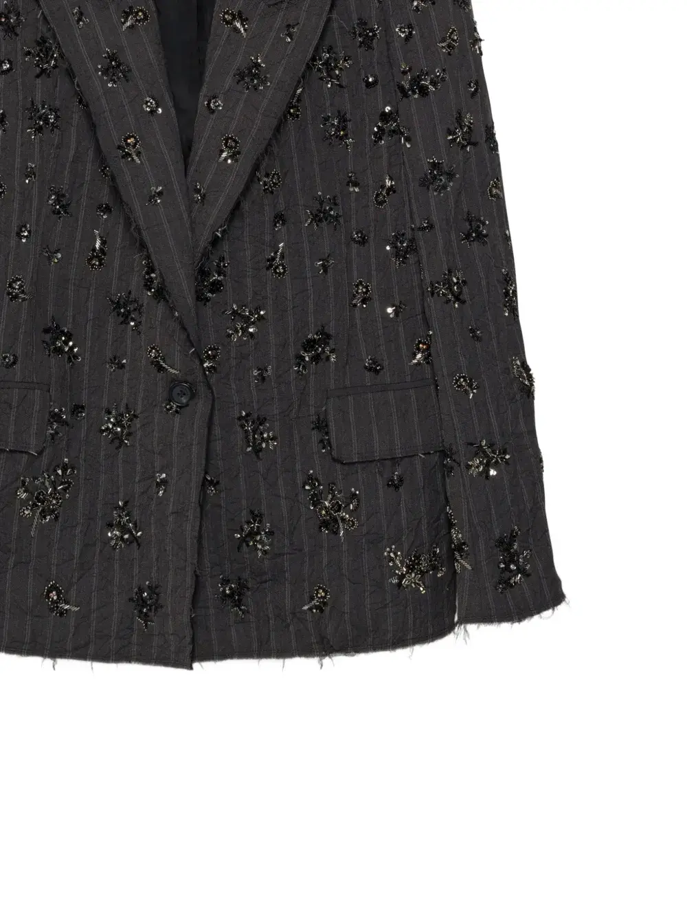 дизайн в угольных тонах в полоску, декоративные элементы, передние карманы, застёжка на пуговицы, лацканы пиджака