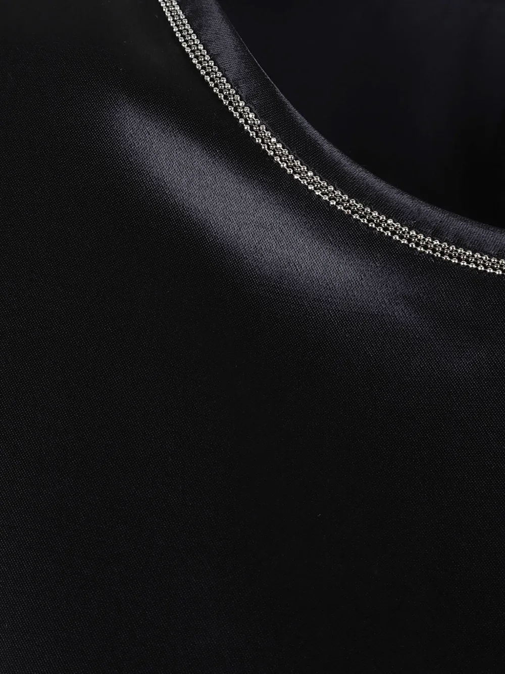 черная отделка бисером, круглый вырез, без рукавов, вырез-капля на спине, застежка на пуговицу сзади