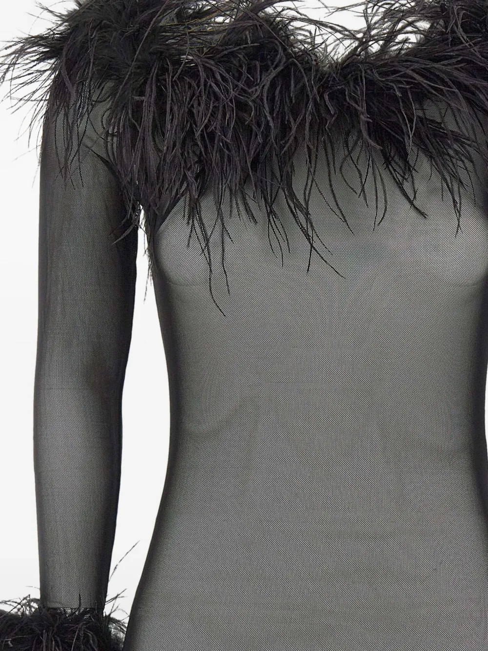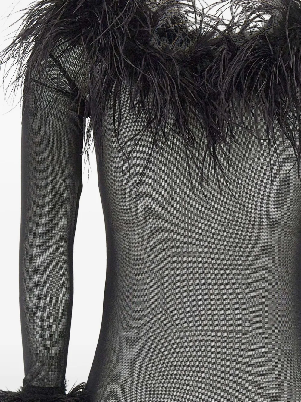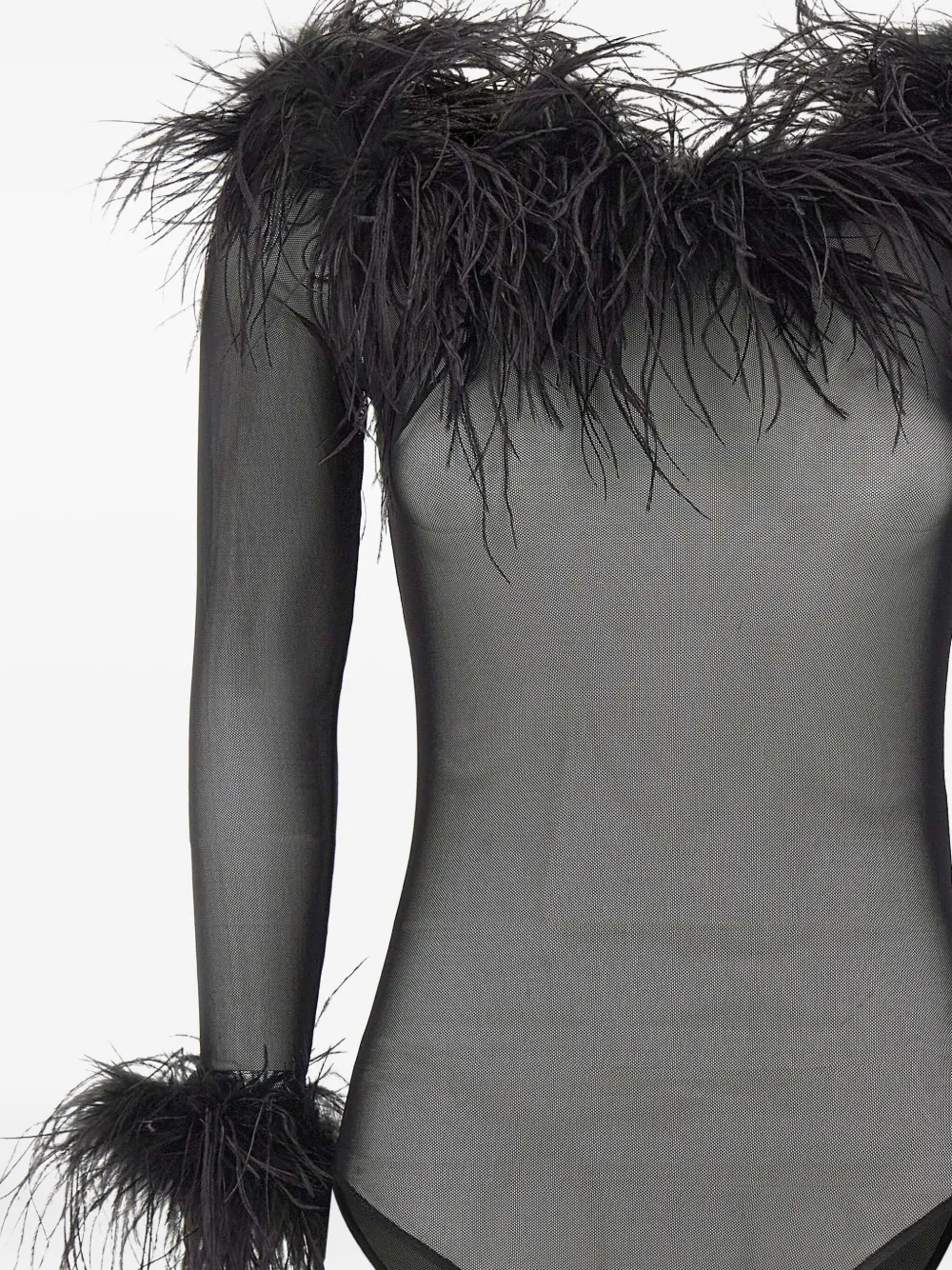 черная фатиновая блуза с вырезом "лодочка", длинными рукавами и отделкой из перьев по низу