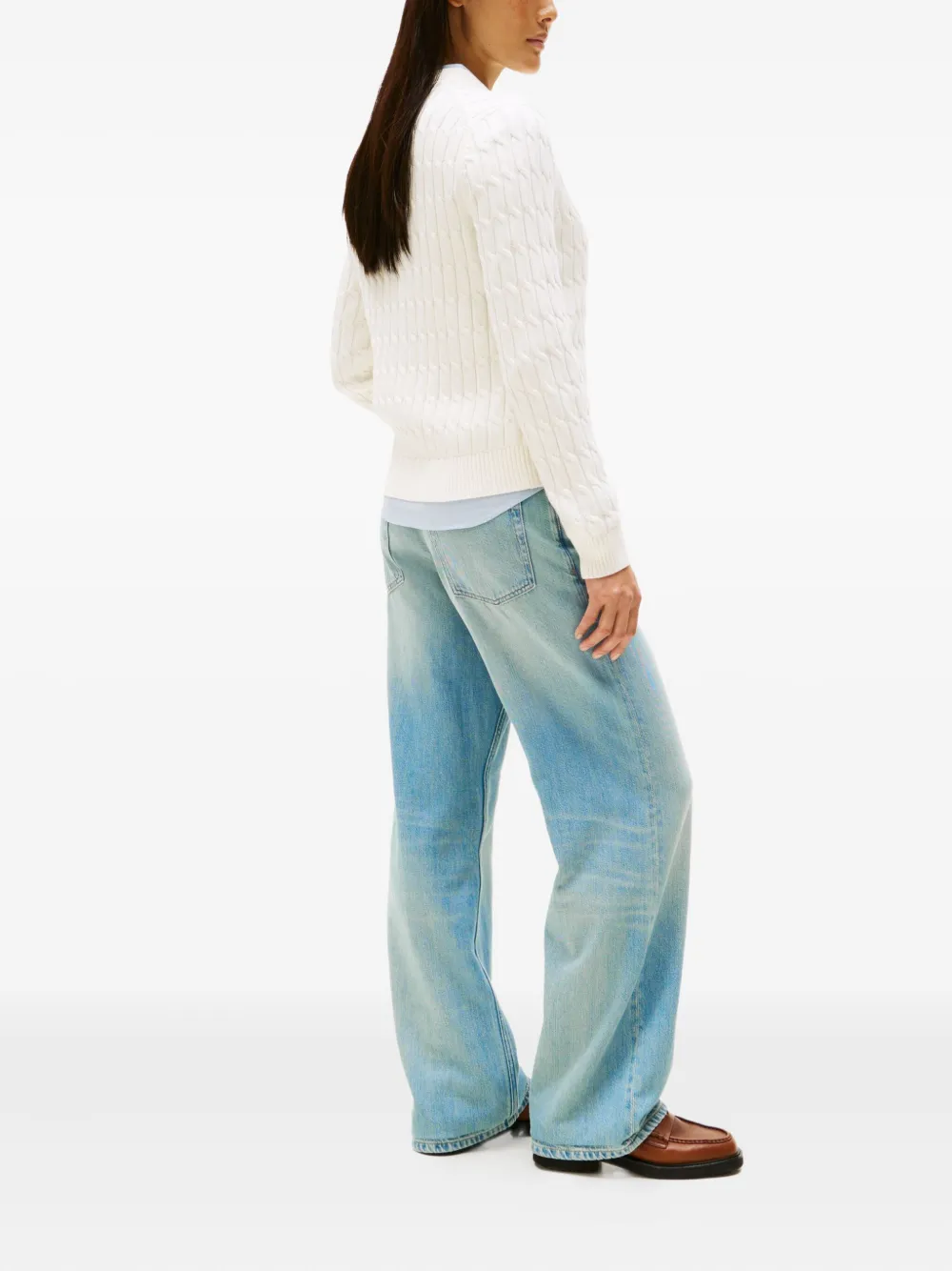 белый трикотажный свитер с косами, застежкой на пуговицы, длинными рукавами, круглым вырезом и логотипом