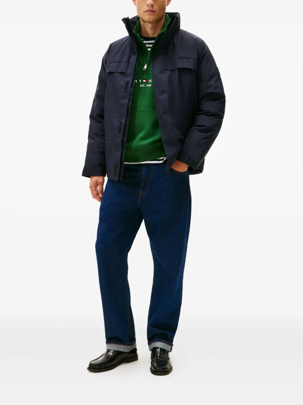темно-синий высокий воротник передние карманы длинные рукава нашивка с логотипом застежка-молния