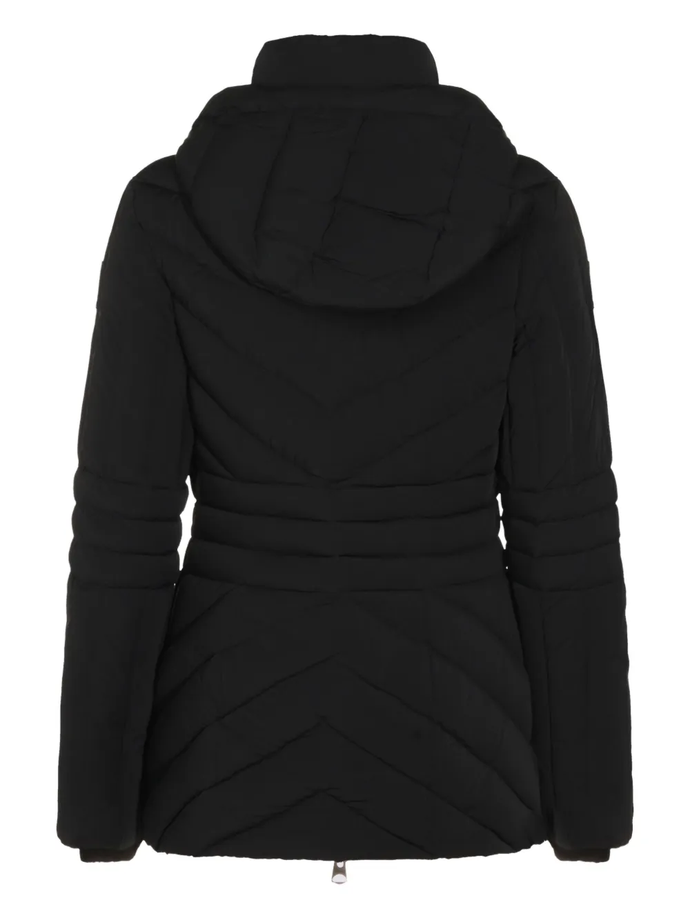 черная стежка "елочкой", застежка-молния, капюшон, пояс на талии, карманы на молнии