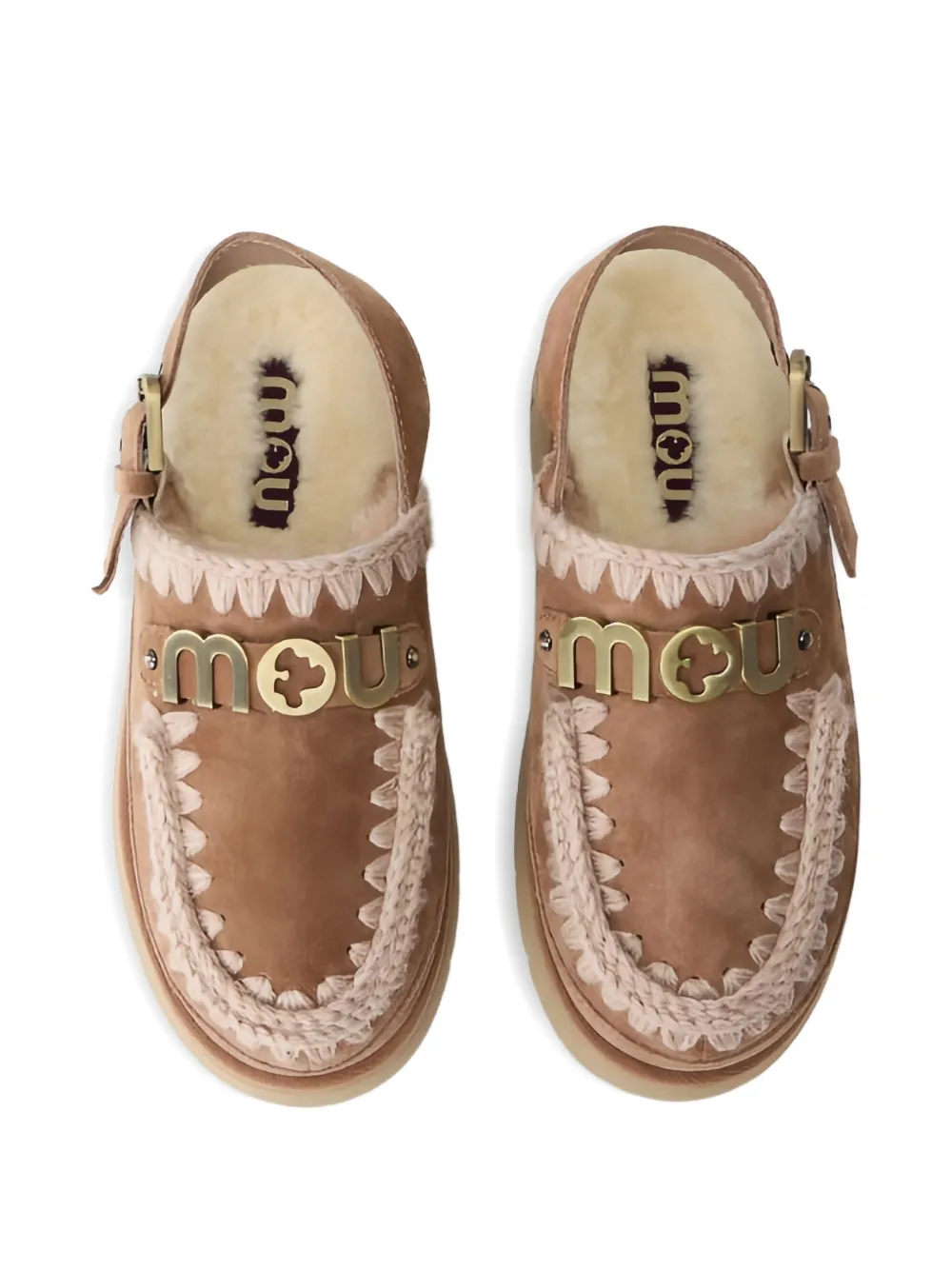 коричневый ремешок сзади, застежка-пряжка, логотип, платформенная подошва, отделка крючком