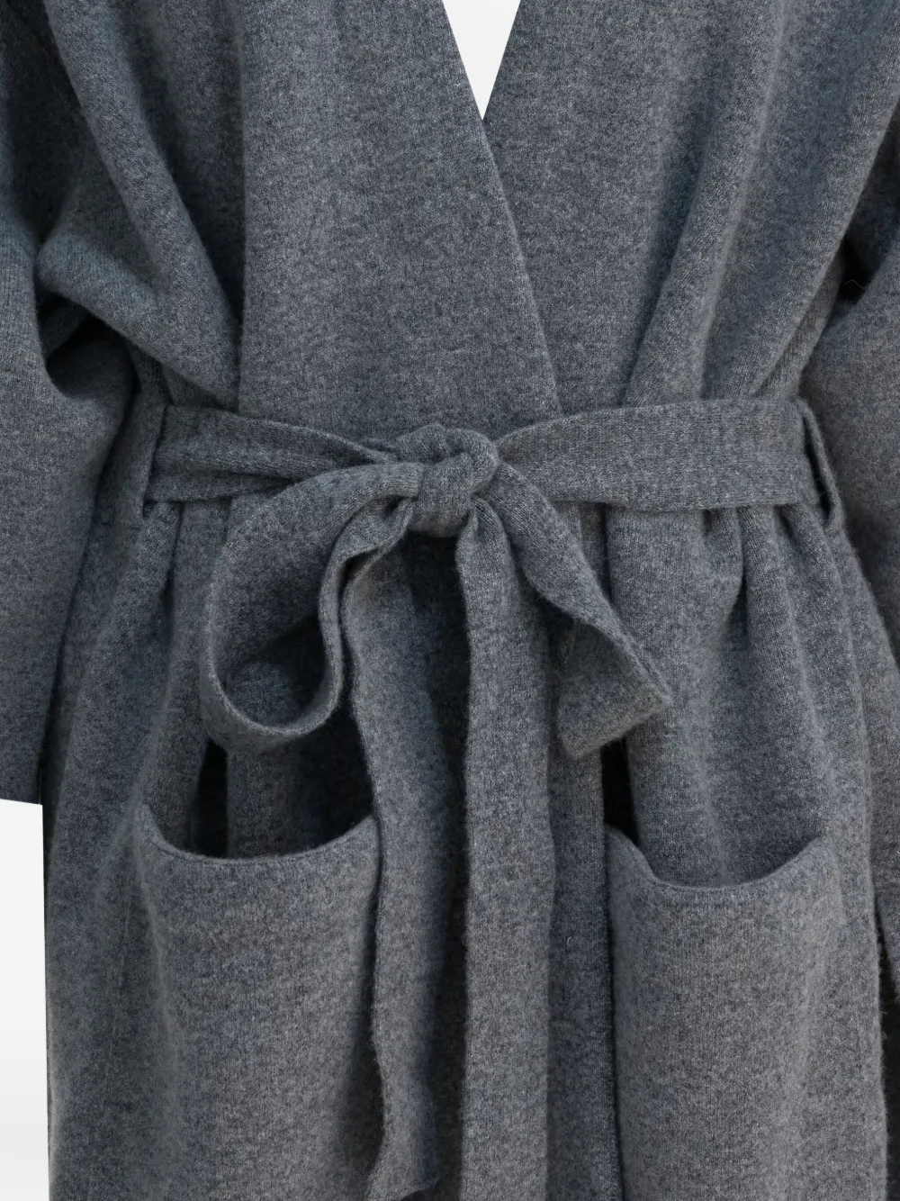 Серый жакет открытого кроя с поясом, накладными карманами и длинными рукавами