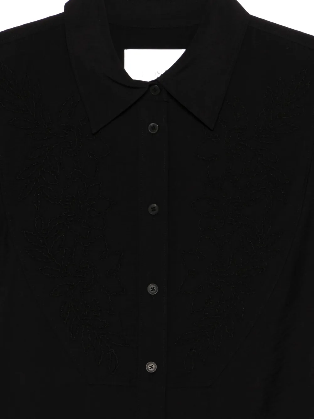 черная рубашка с цветочной вышивкой, застежкой на пуговицы, длинными рукавами, классическим воротником и фигурным подолом