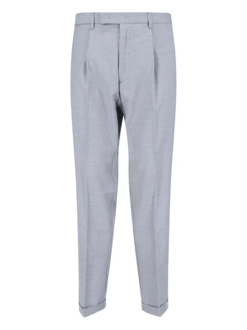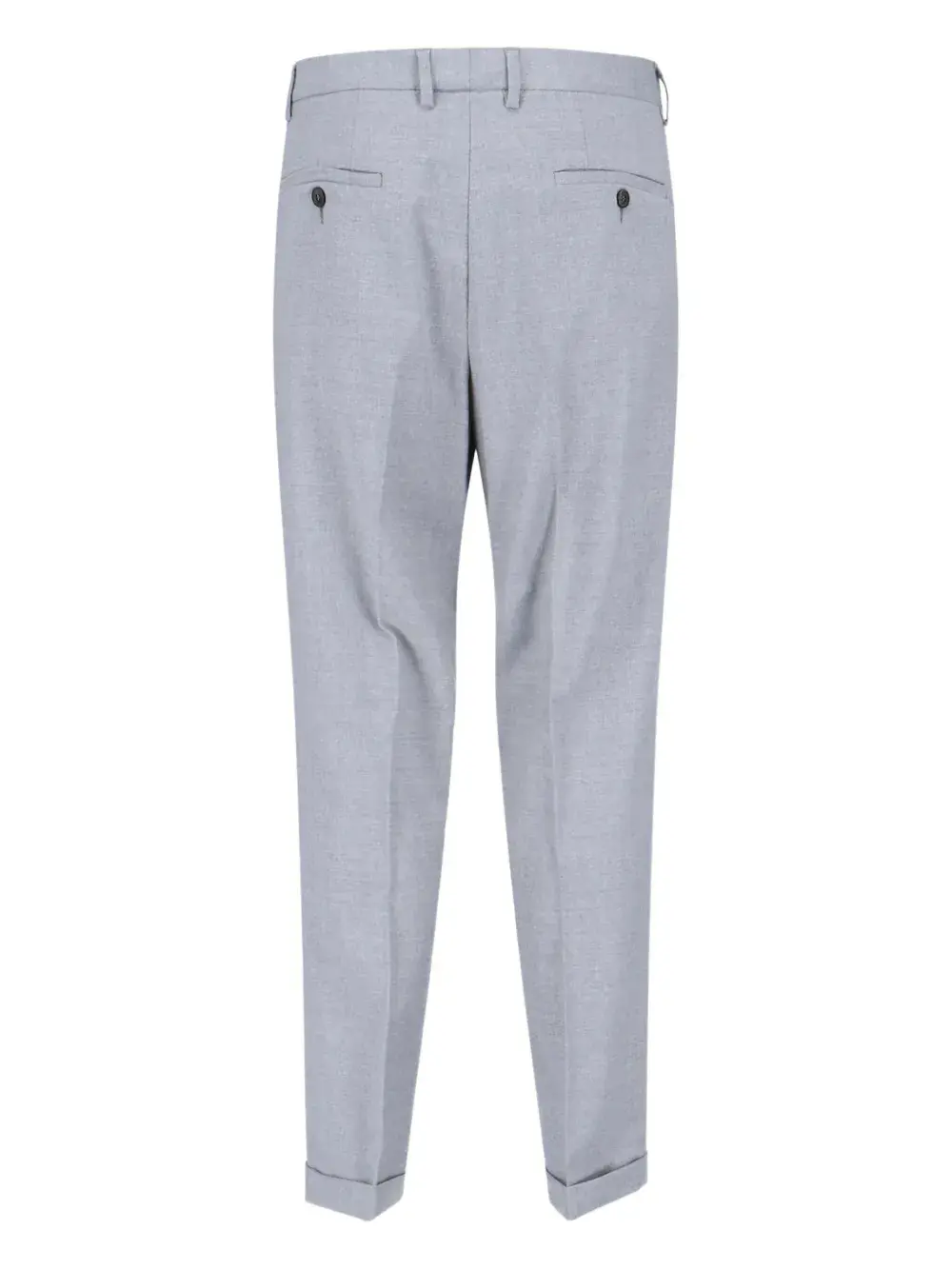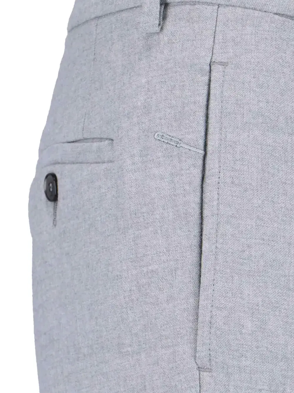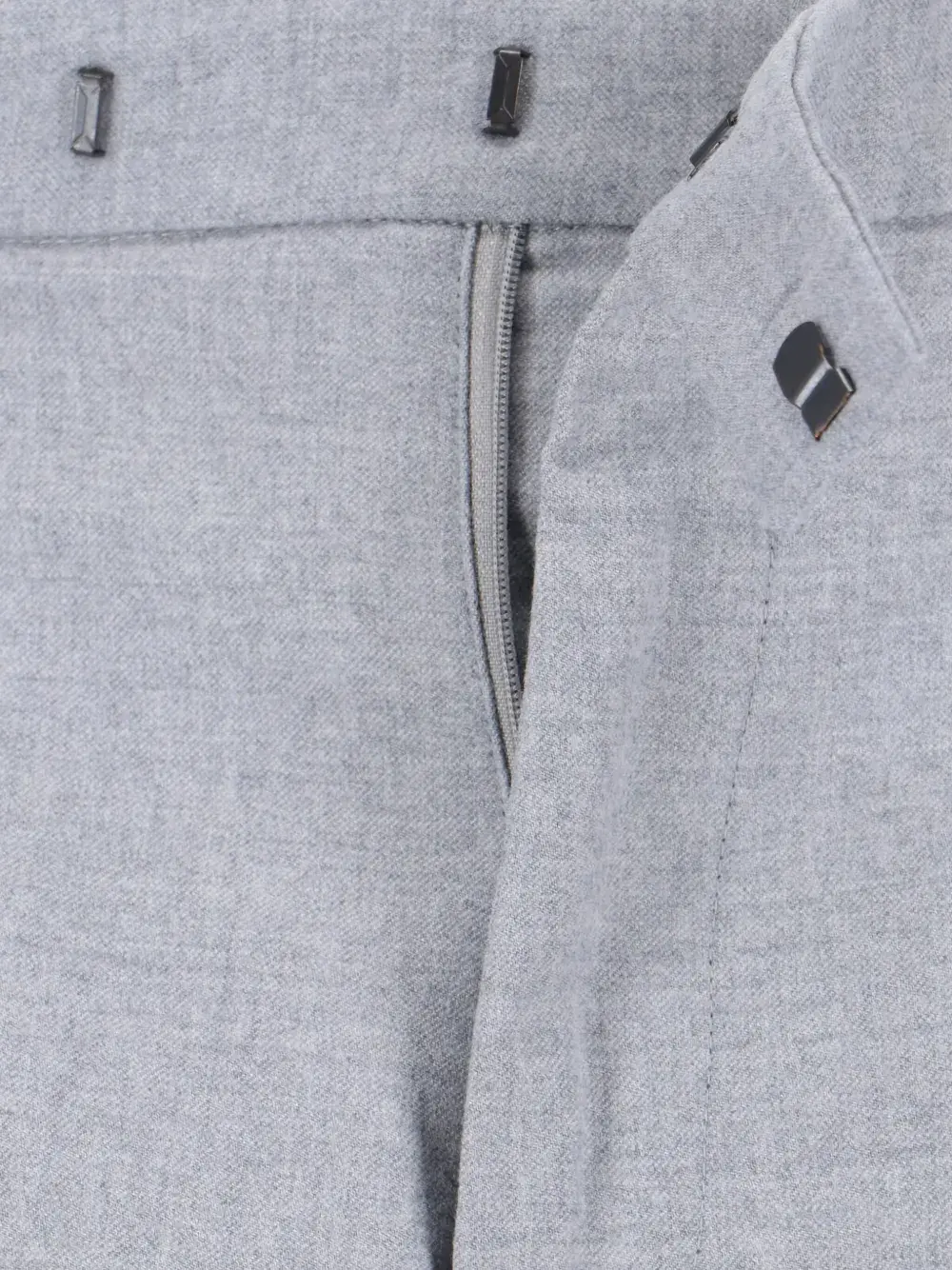 серый цвет, манжеты по краю, шлевки для ремня, задние прорезные карманы, застежка на молнию